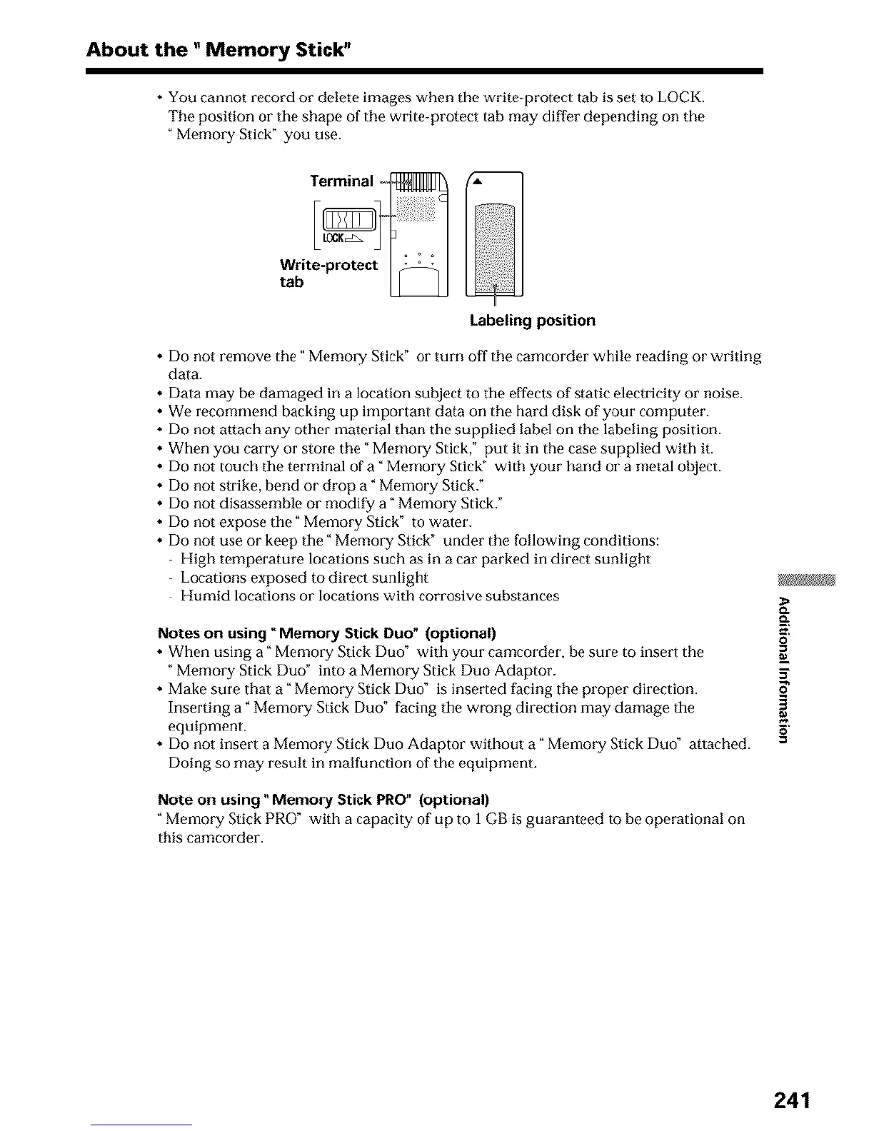 • When using a" Memory Stick Duo" with your camcorder, he sure to insert the