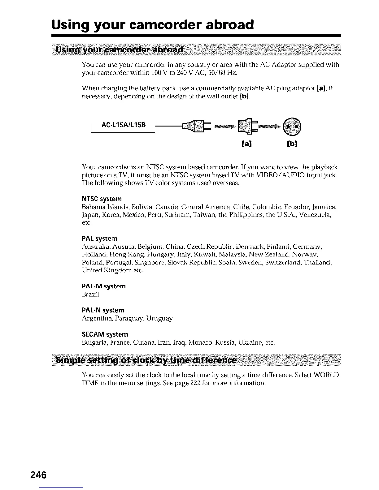 You can use your camcorder in any country or area with the AC Adaptor supplied with