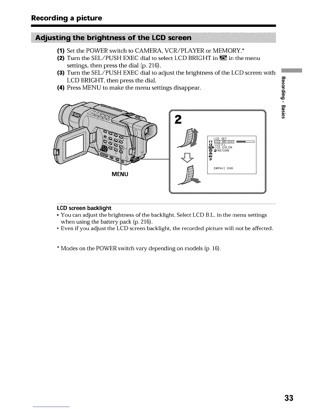 • Even if you adjust the LCD screen backlight, the recorded picture will not be affocted.