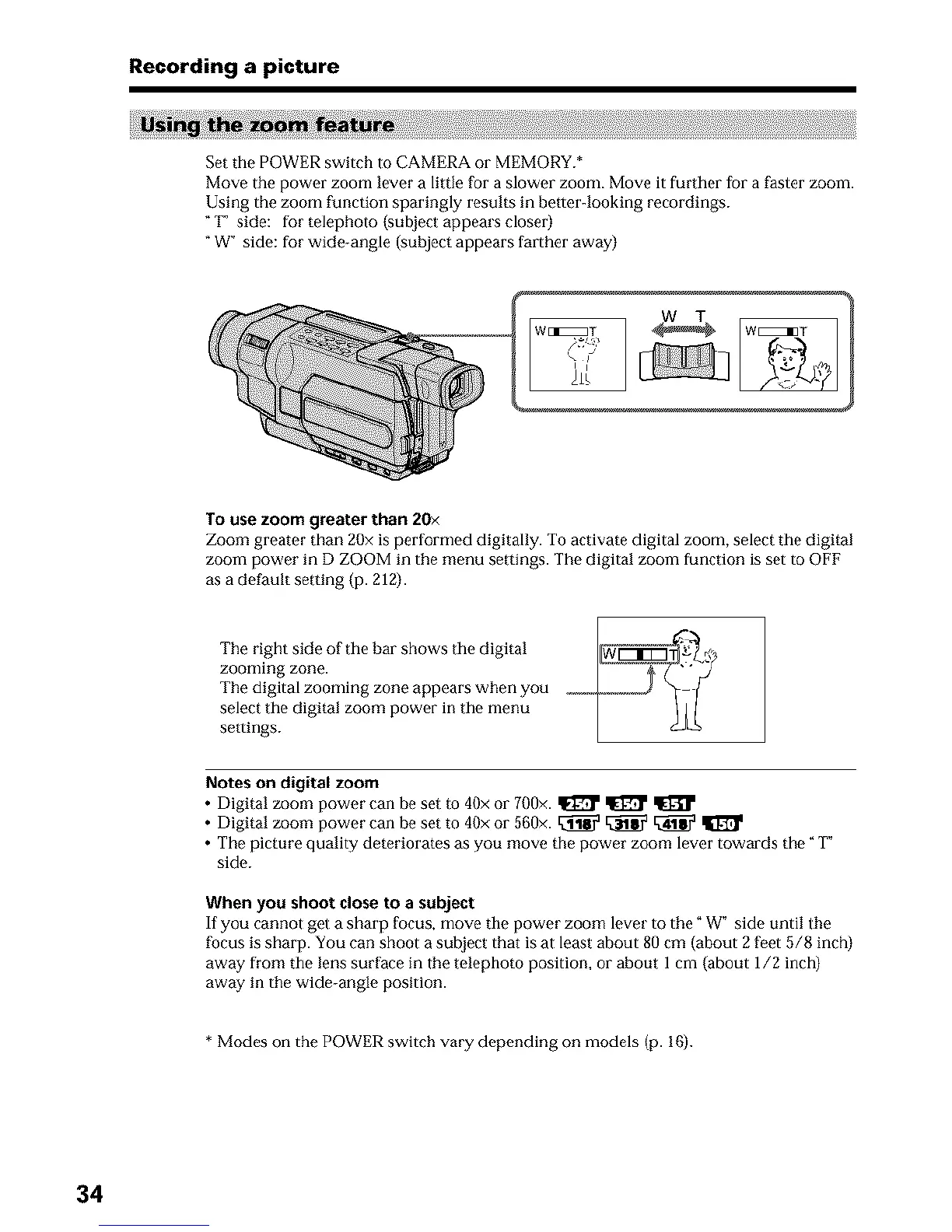 • The picture quality deteriorates as you move the power zoom lever towards the" T"