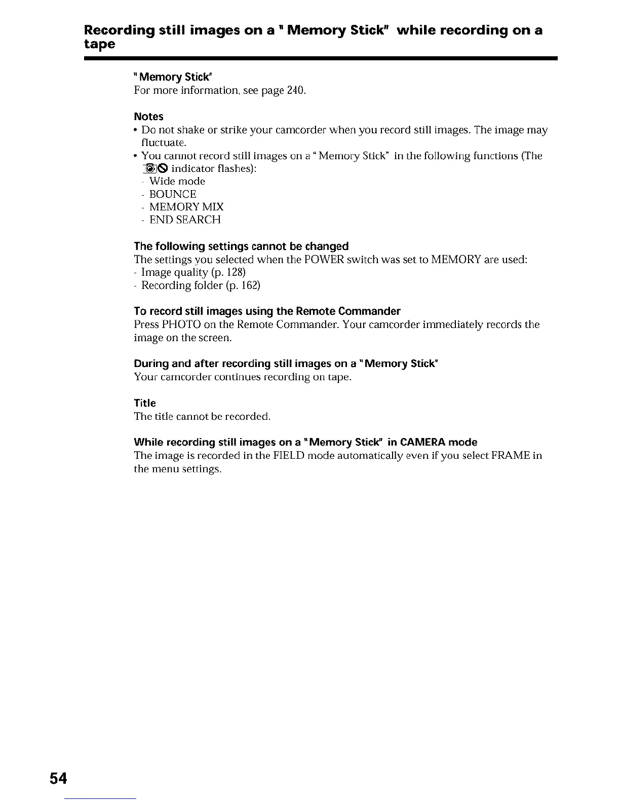 • You cannot record still images on a" Memory Stick" in tile following functions (The