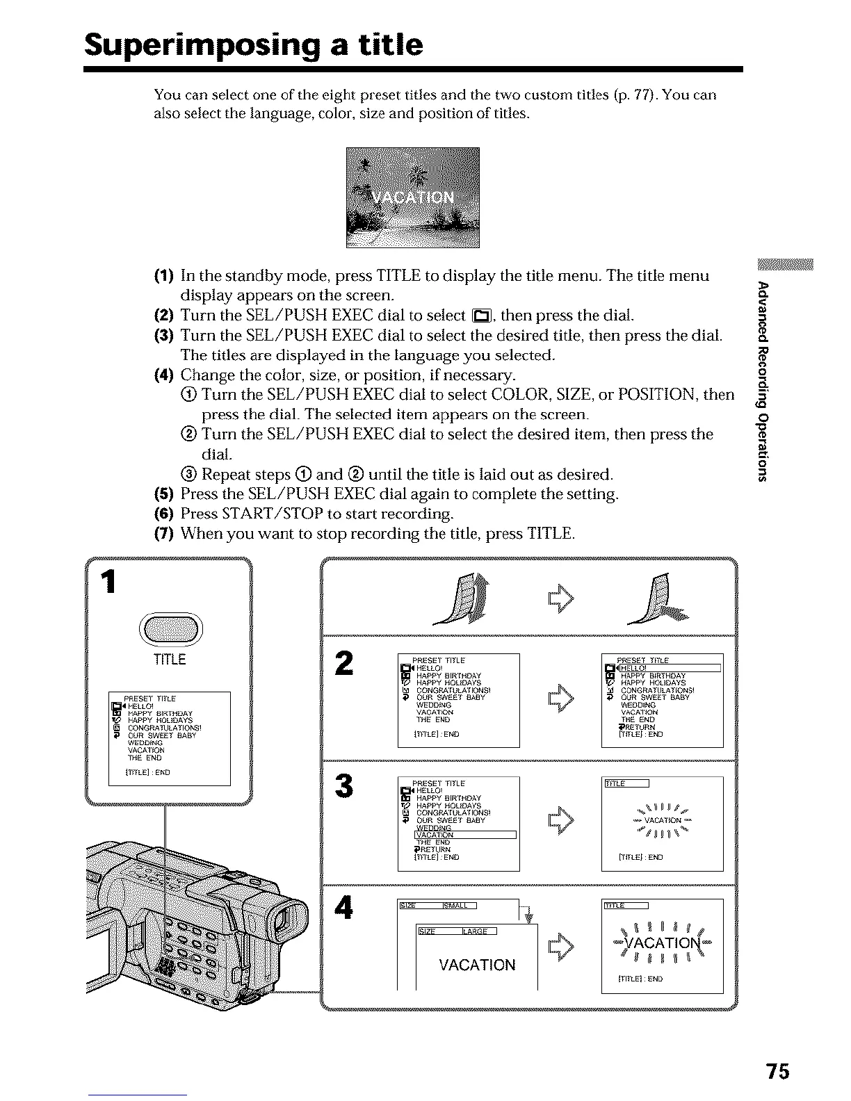 You can select one of the eight preset titles and the two custom titles (p. 77). You can