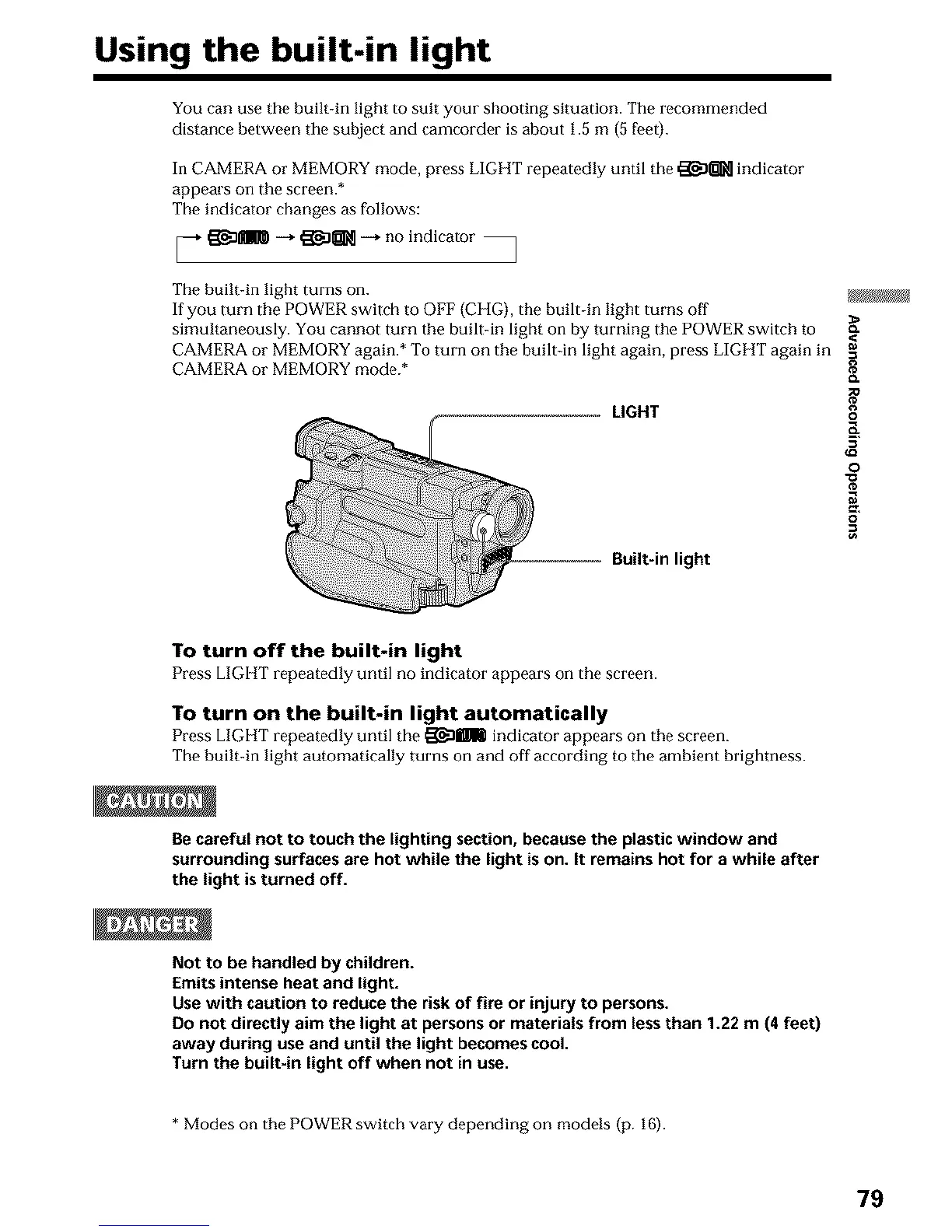 simultaneously. You cannot turn the built-in light on by turning the POWER switch to