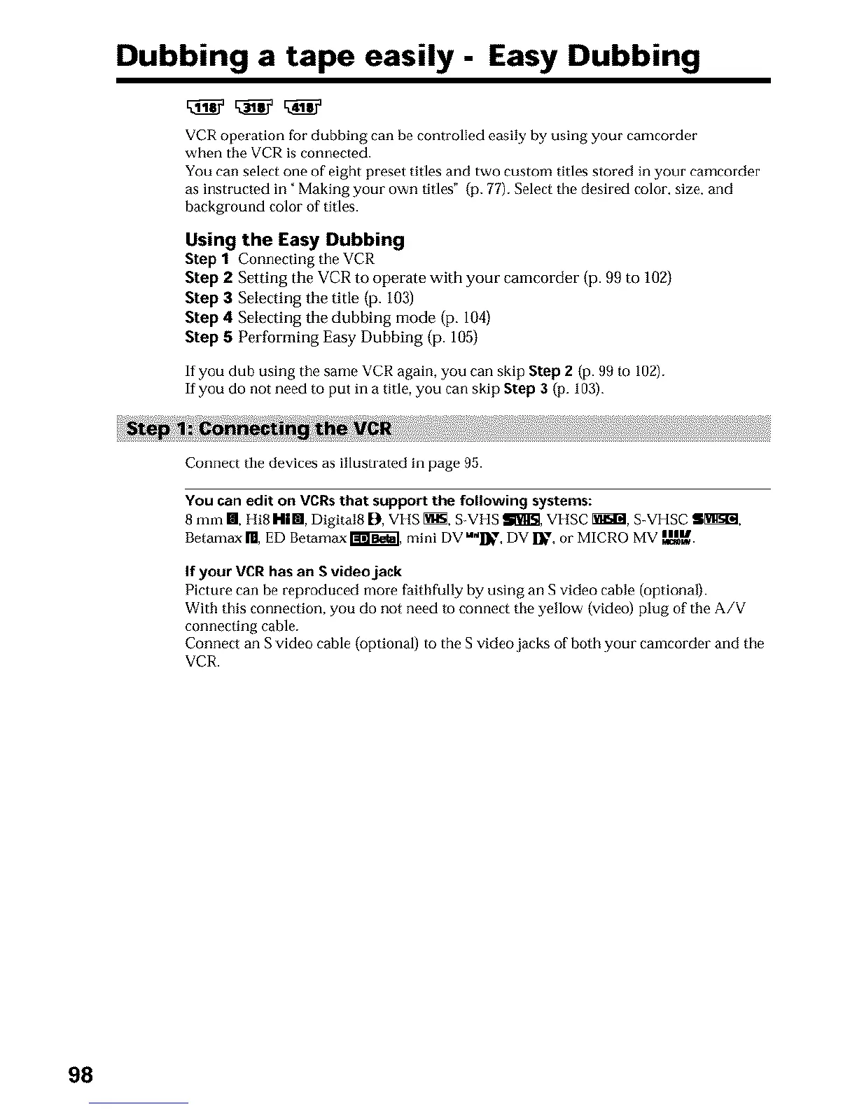 Step 2 Setting the VCR to operate with your camcorder (p. 99 to 102)