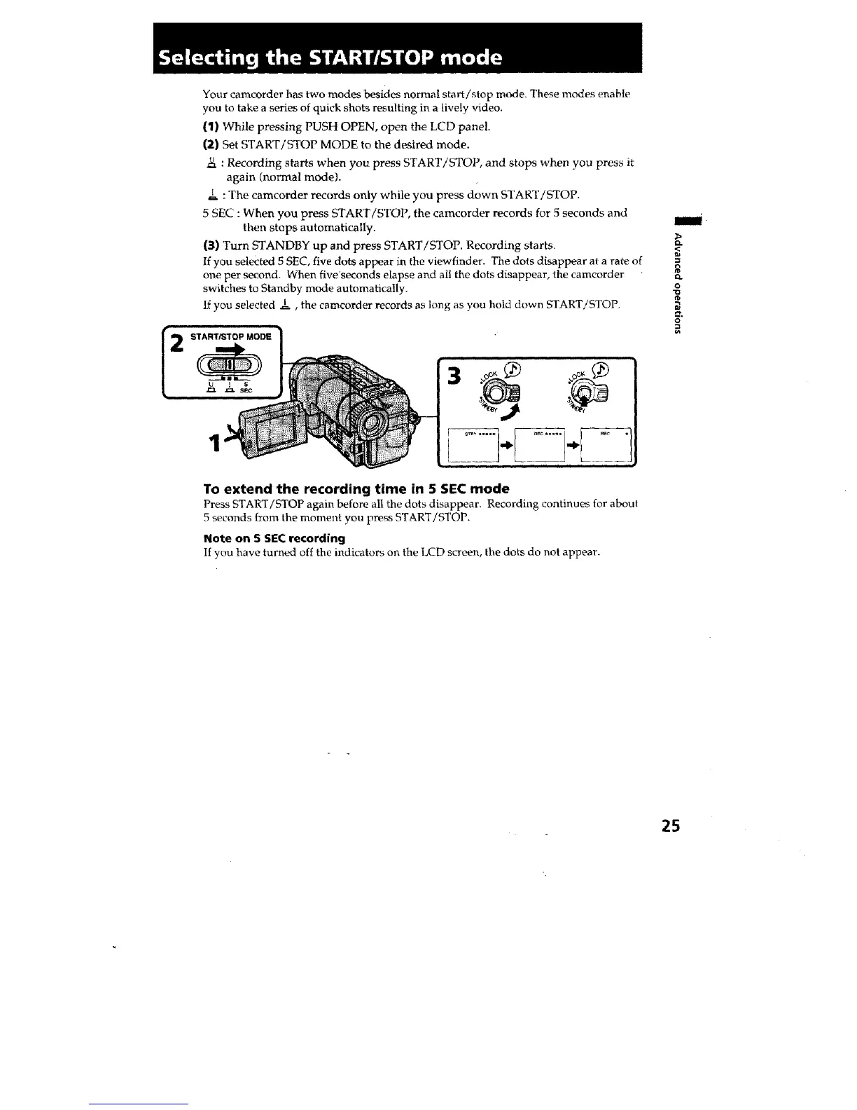 Your camcorder has two modes besides normal start!stop mode. These modes enable