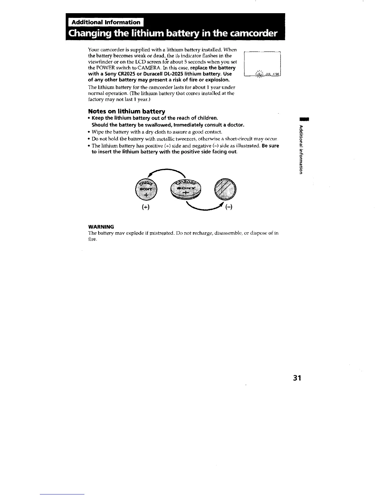 Your camcorder is supplied with a lithium battery installed. When