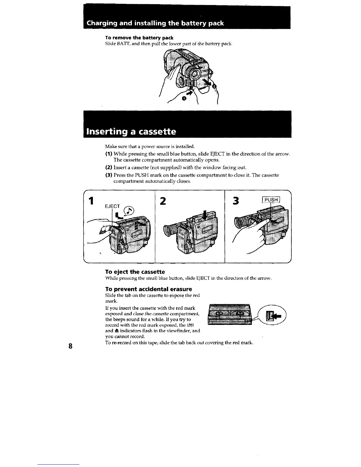 (1) While pressing the small blue button, slide EJECT in the direction of the arrow.
