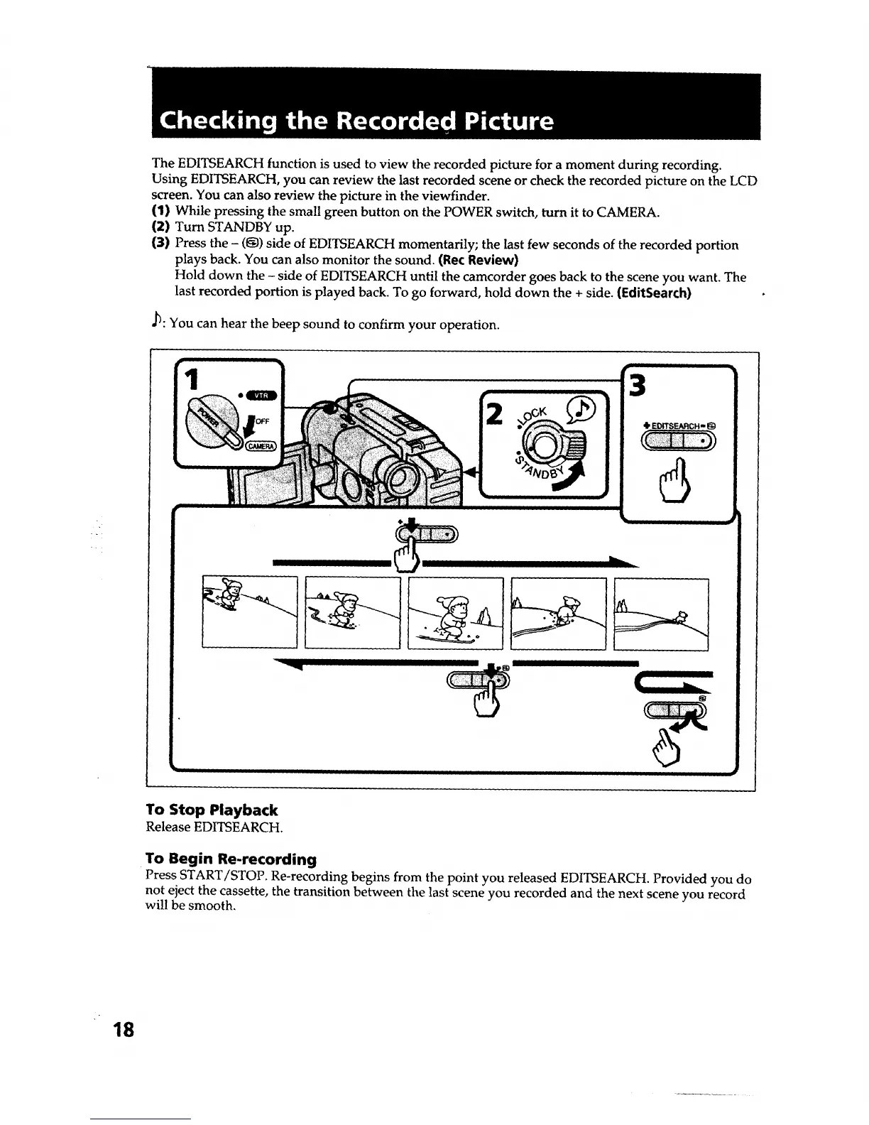 Using EDITSEARCH, you can review the last recorded scene or check the recorded picture on the LCD