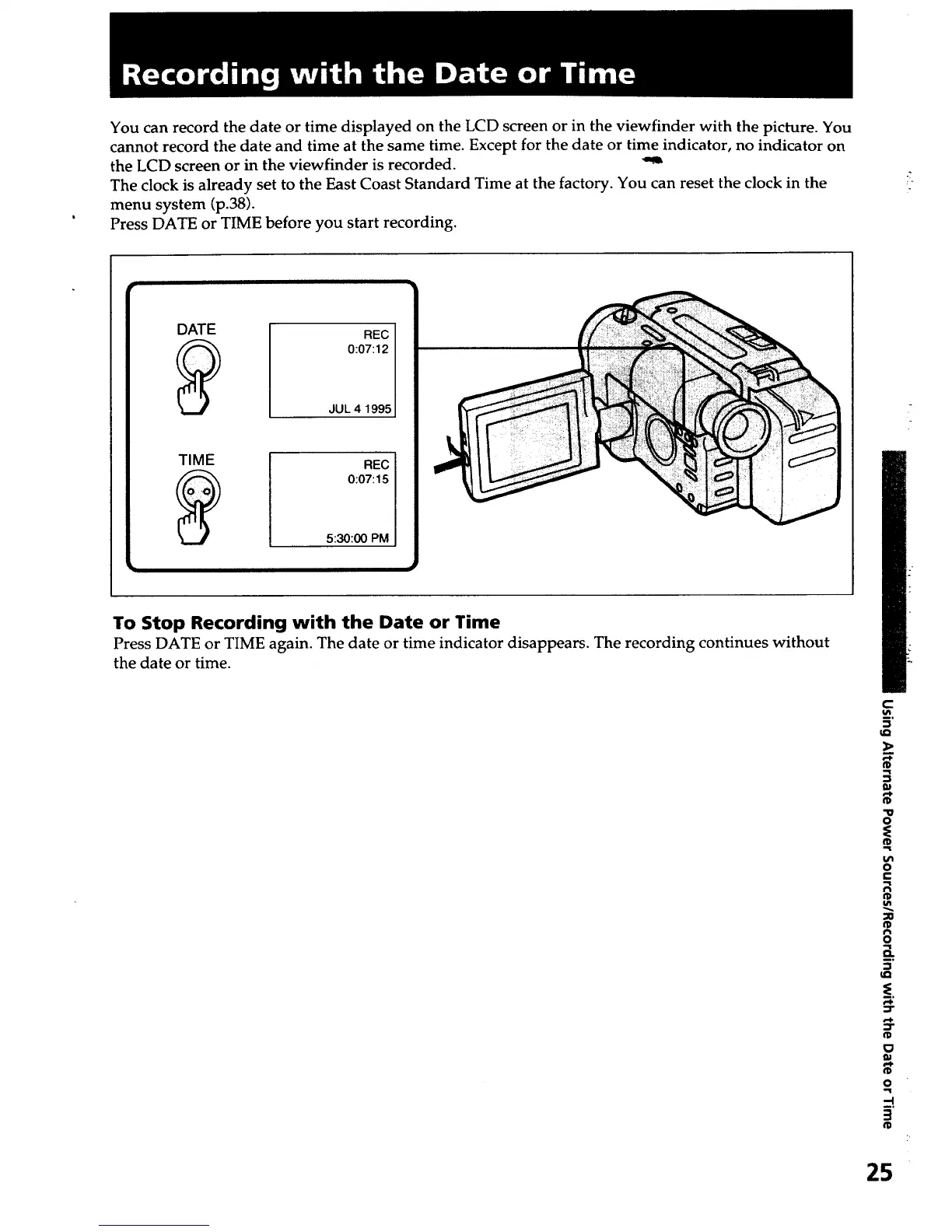 Press DATE or TIME again. The date or time indicator disappears. The recording continues without