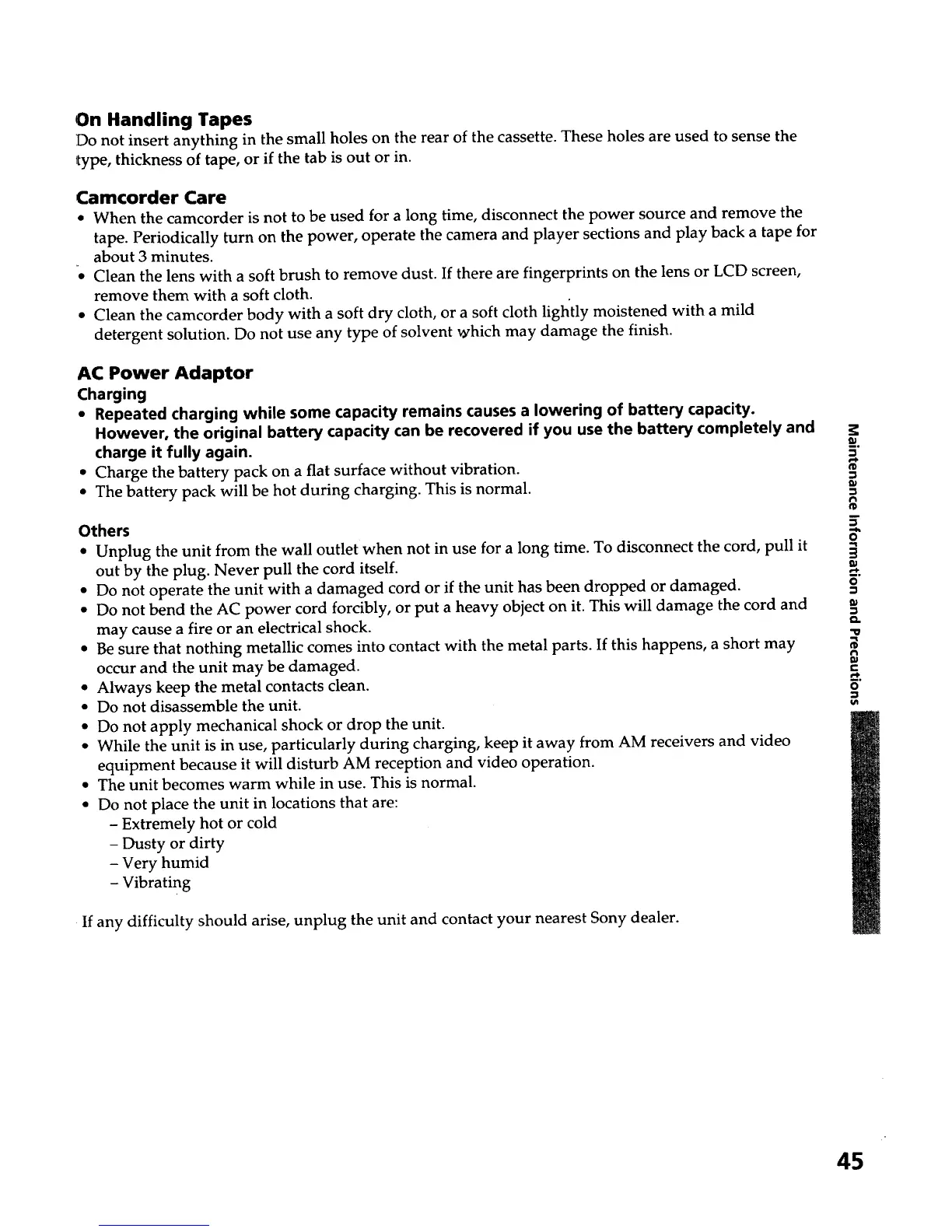 If any difficulty should arise, unplug the unit and contact your nearest Sony dealer.