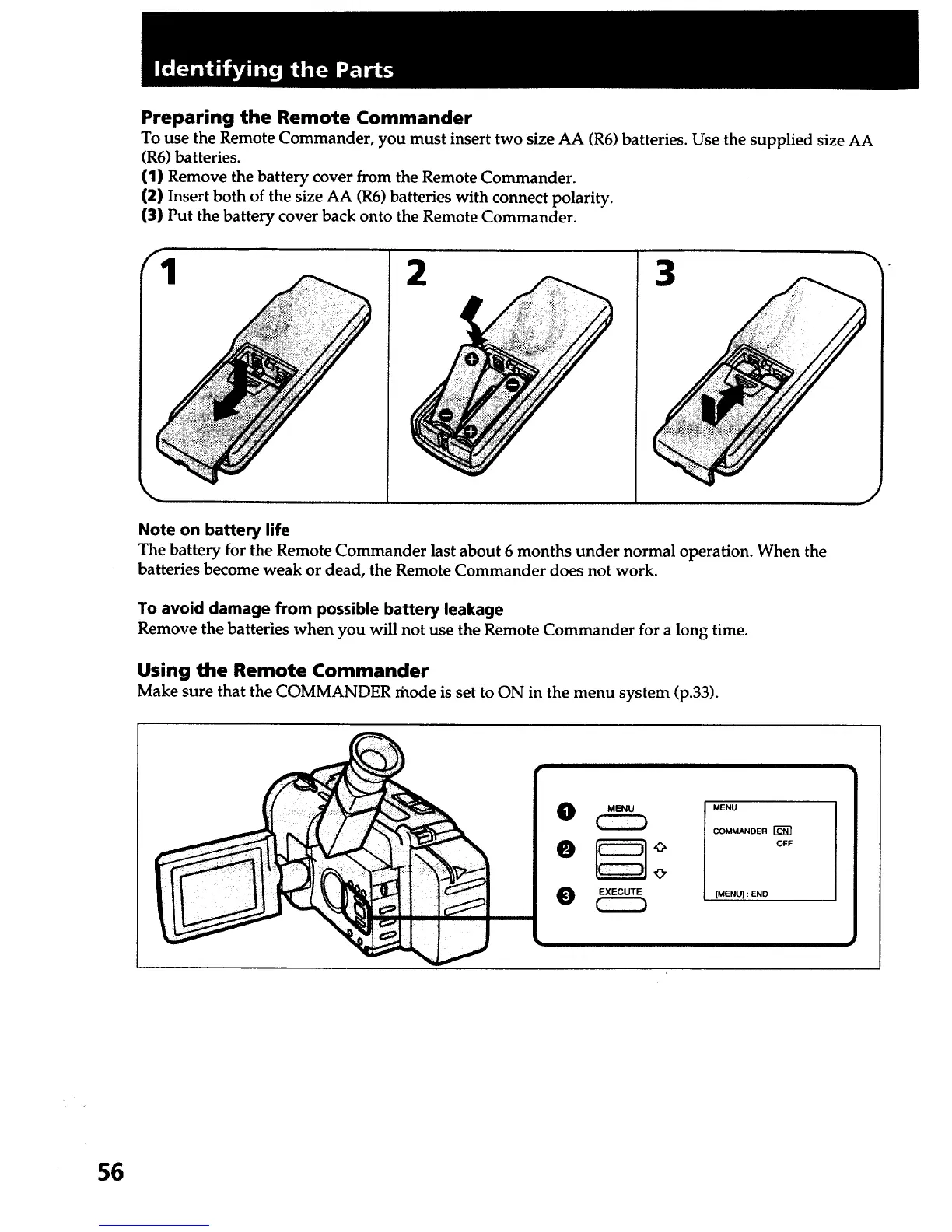 To use the Remote Commander, you must insert two size AA (R6) batteries. Use the supplied size AA