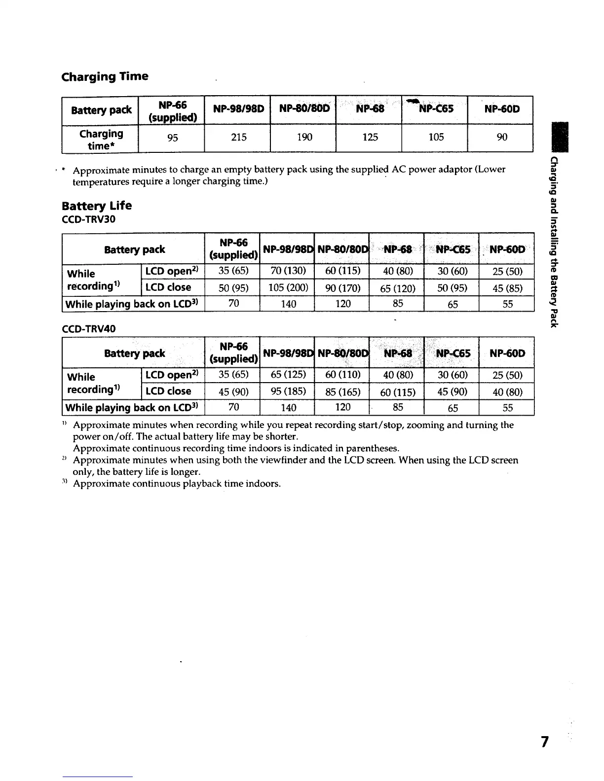 ' * Approximate minutes to charge an empty battery pack using the supplied AC power adaptor (Lower