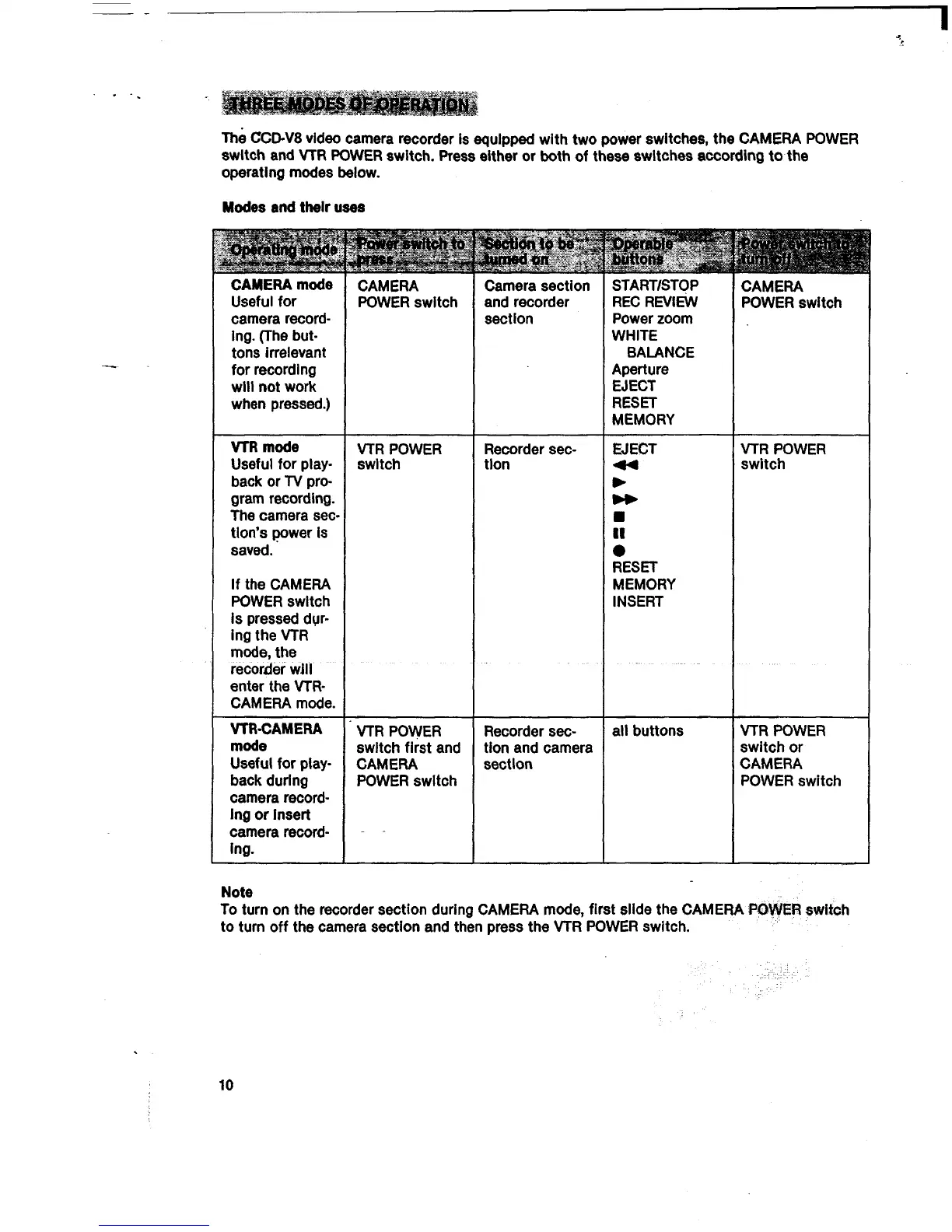 Sony CCD-V8 - Operating Modes; Camera Mode and VTR Mode; VTR-Camera Mode and Operational Notes