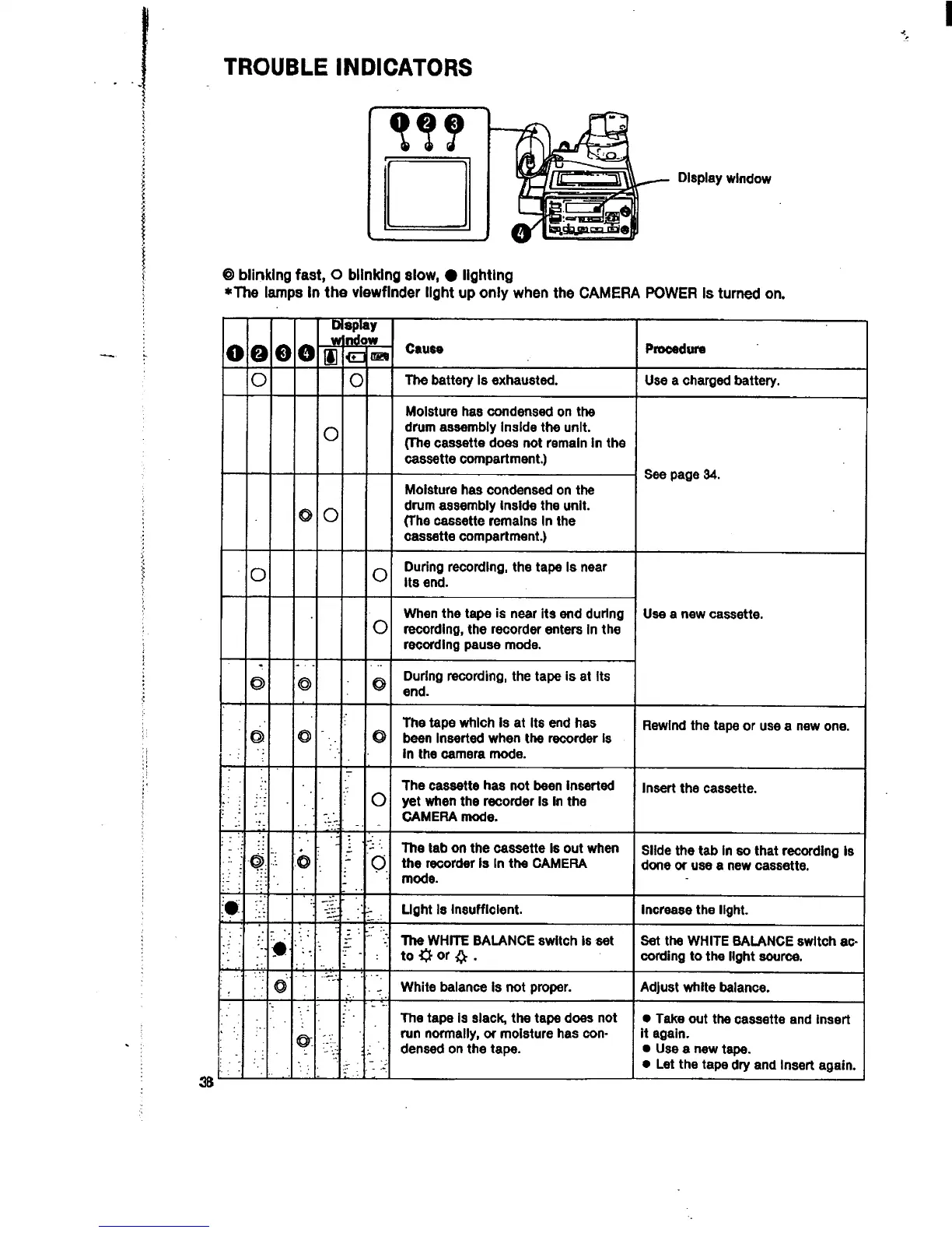 Sony CCD-V8 - Trouble Indicator Reference; Display Window and Viewfinder Indicators
