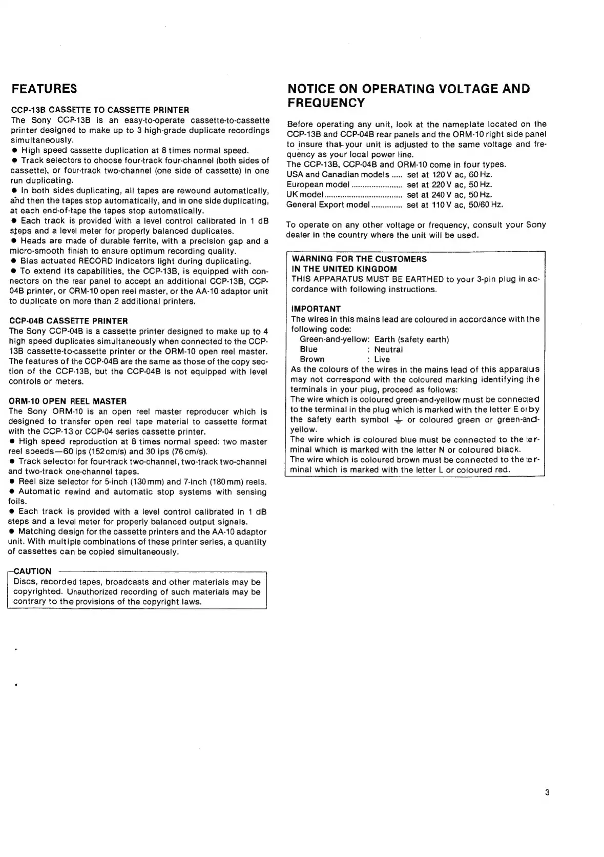 Sony CCP-13B - Warning; Notice on Operating Voltage and Frequency