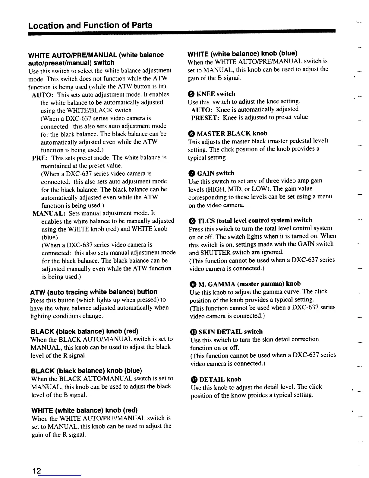 Sony CCU-TX7 - Camera Operation Unit Controls: Advanced Functions; White Balance, Knee, and Gain Settings; TLCS, Gamma, Detail, and Skin Detail Functions