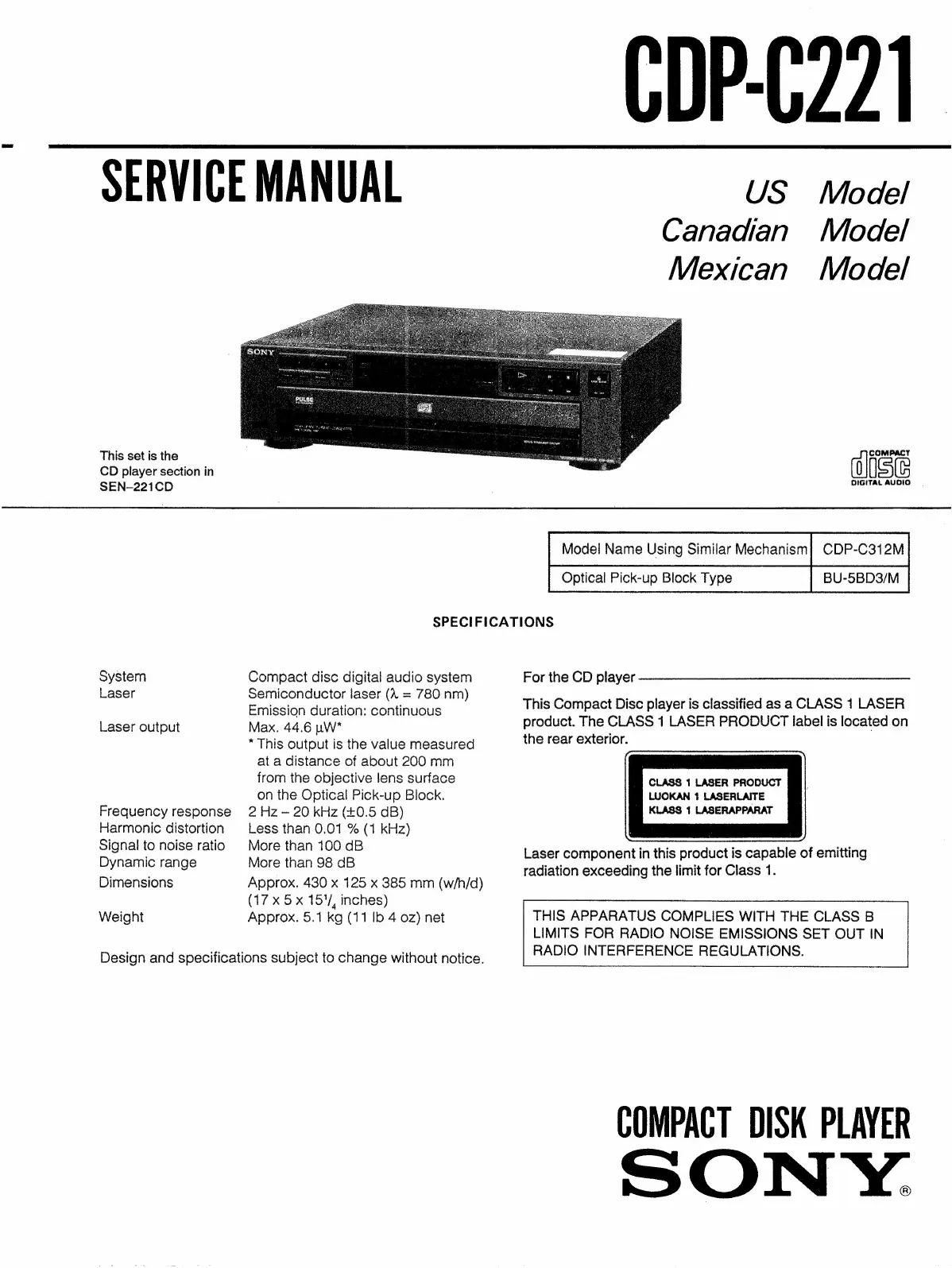 Sony CDP-0231 - Specifications