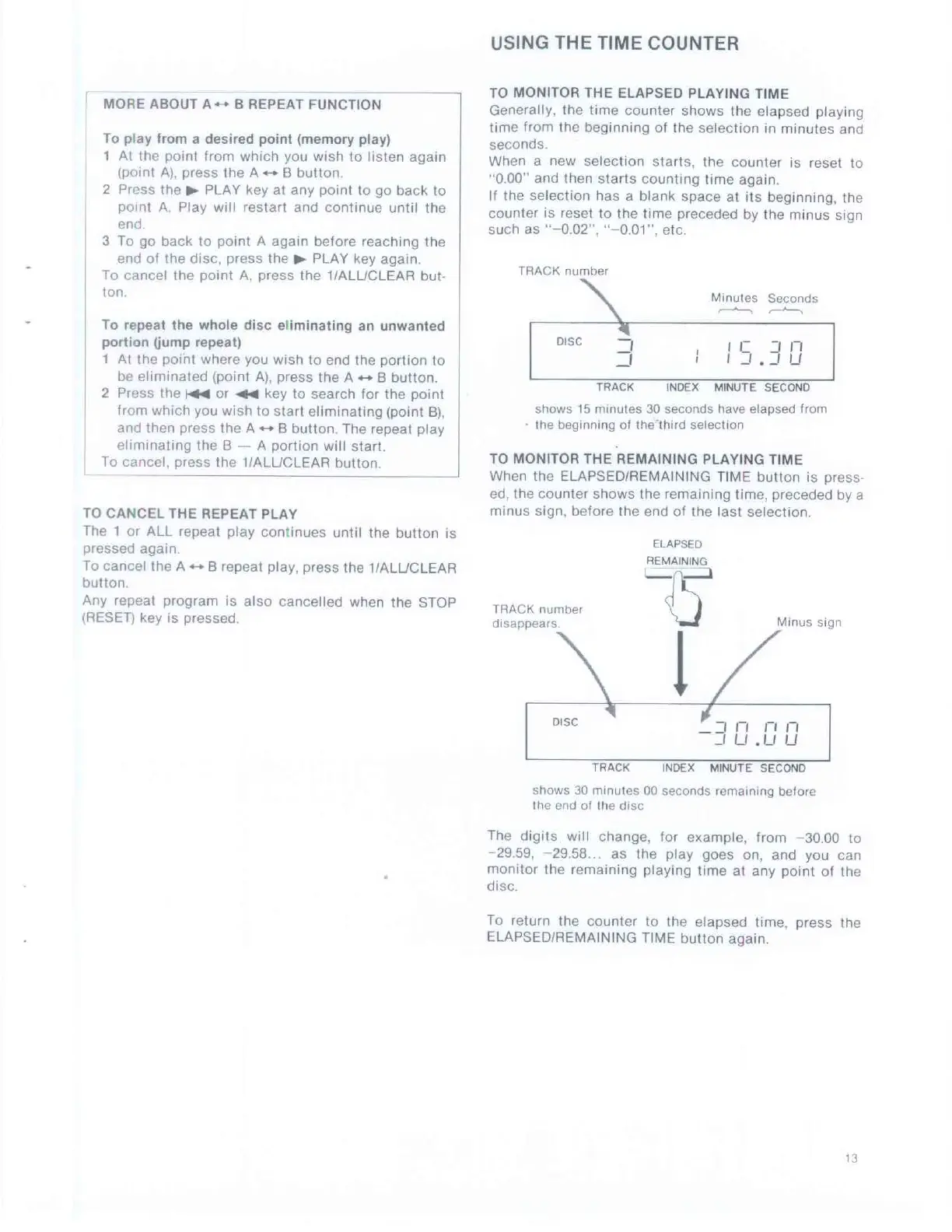 Sony CDP-102 - Using the Time Counter; To Cancel the Repeat Play; To Monitor the Elapsed Playing Time; To Monitor the Remaining Playing Time