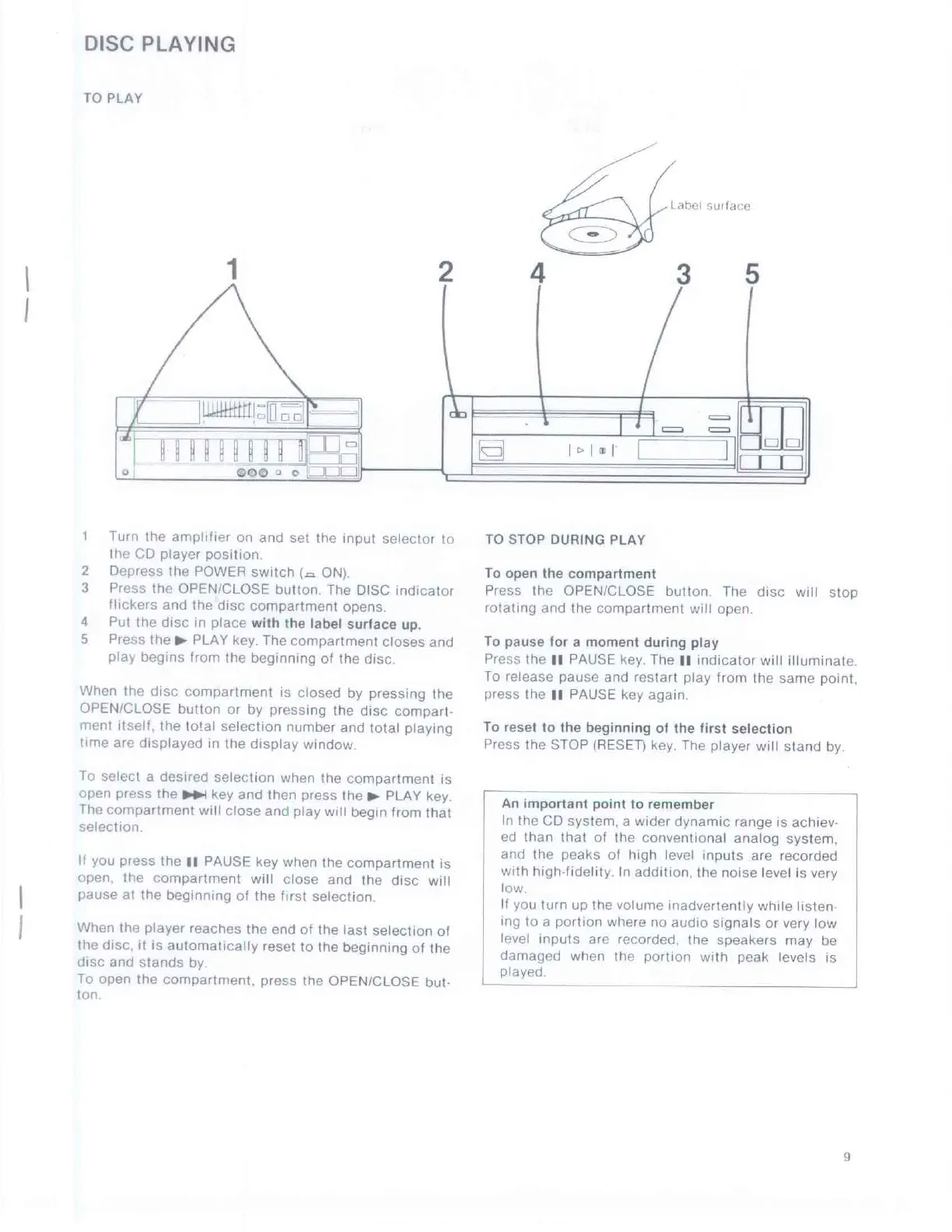 Sony CDP-102 - Disc Playing; To Play; To Stop During Play; To Pause for a Moment During Play