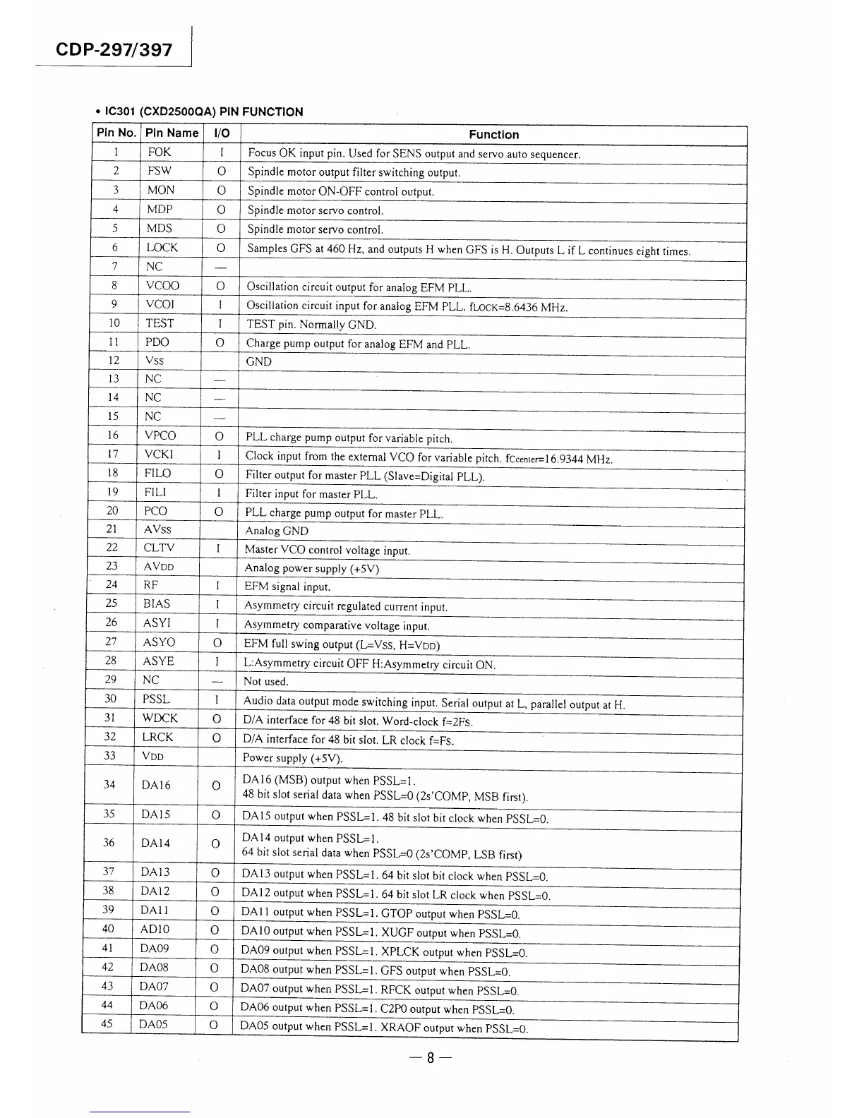 Sony CDP-297 - IC301 CXD2500 QA Pin Function