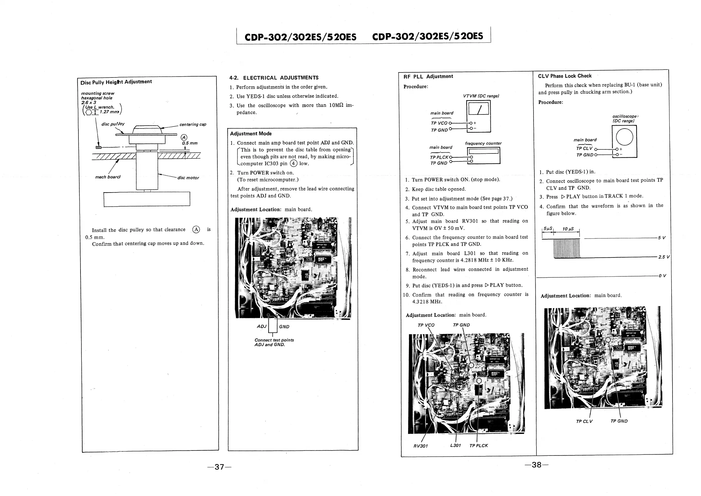 Sony CDP-302 - 4-2. Electrical Adjustments; Disc Pully Height Adjustment; RF PLL Adjustment; CLV Phase Lock Check