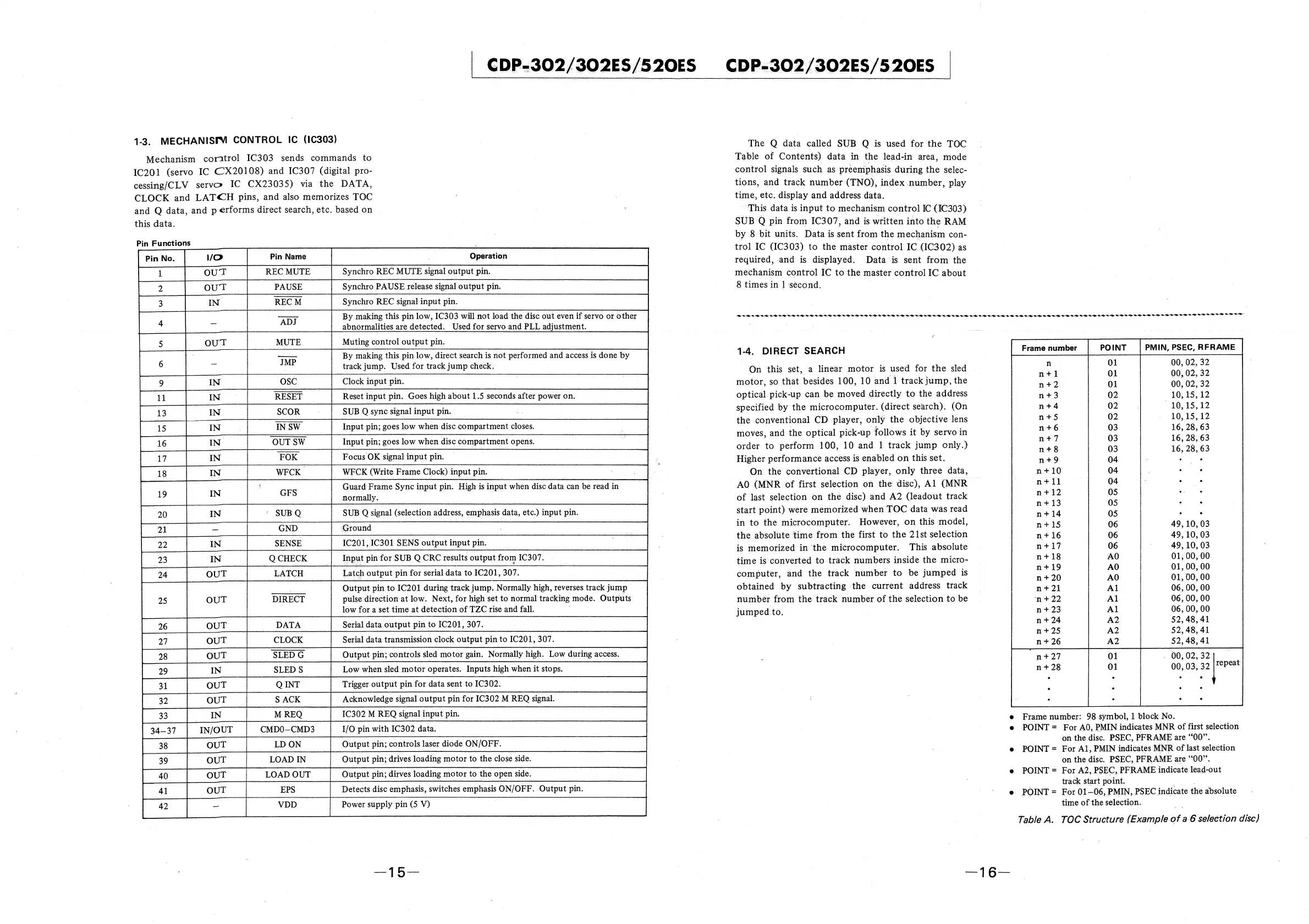 Sony CDP-302ES - Mechanism Control IC (IC303) and Direct Search; IC303 Pin Functions and Direct Search Operation