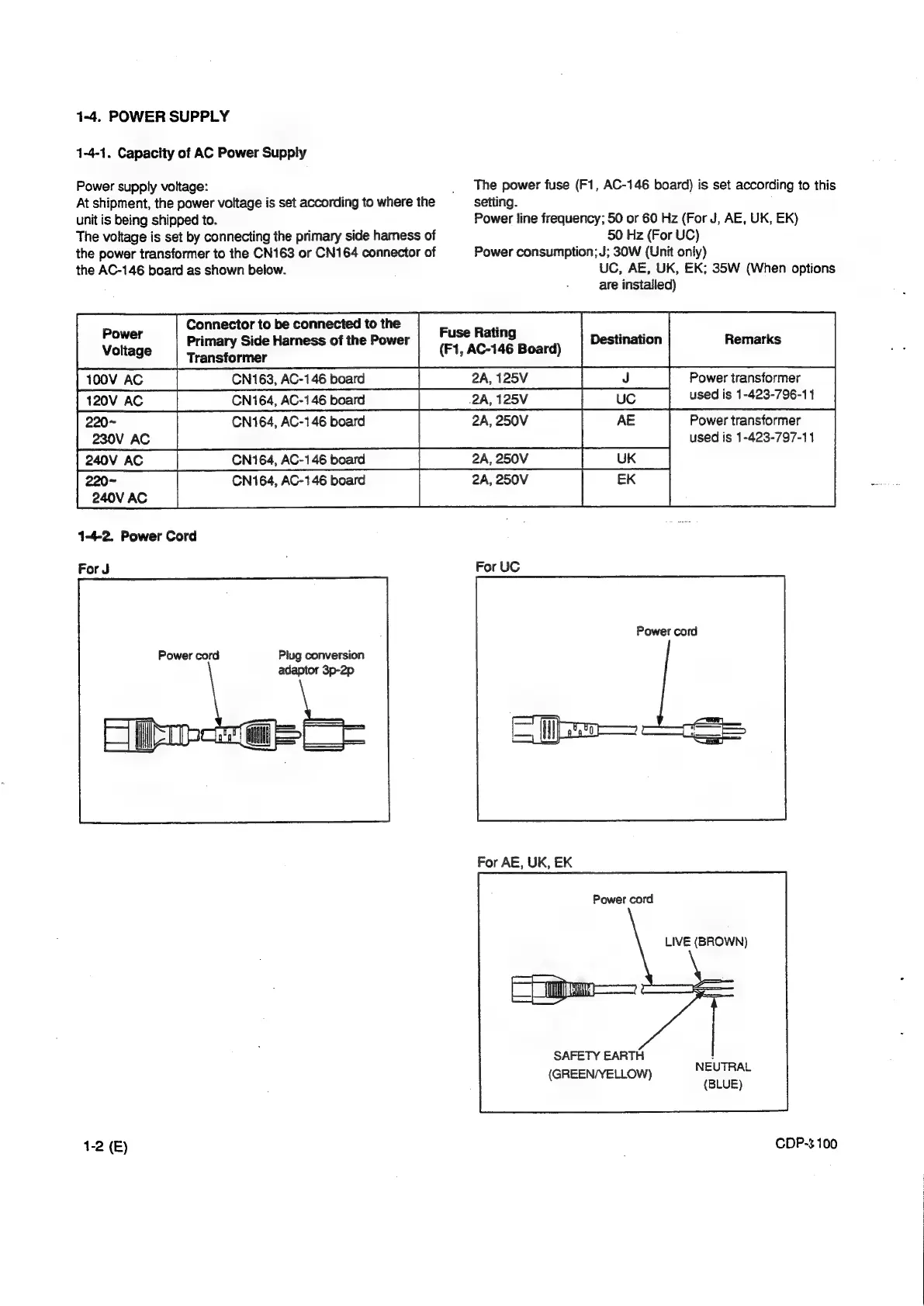 Sony CDP-3100 - Power Supply; Capacity of AC Power Supply; 1-4-2, Power Cord.Ecccccnssesccscecsnesscccnnssesseseecessnssess