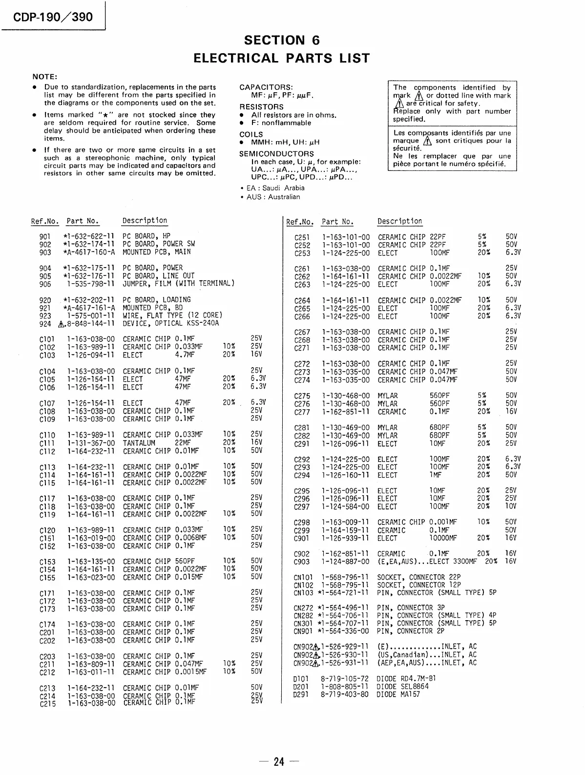 Sony CDP-390 - Electrical Parts List - Capacitors and Resistors; Capacitor Listings; Resistor Listings; Semiconductor and Connector Listings