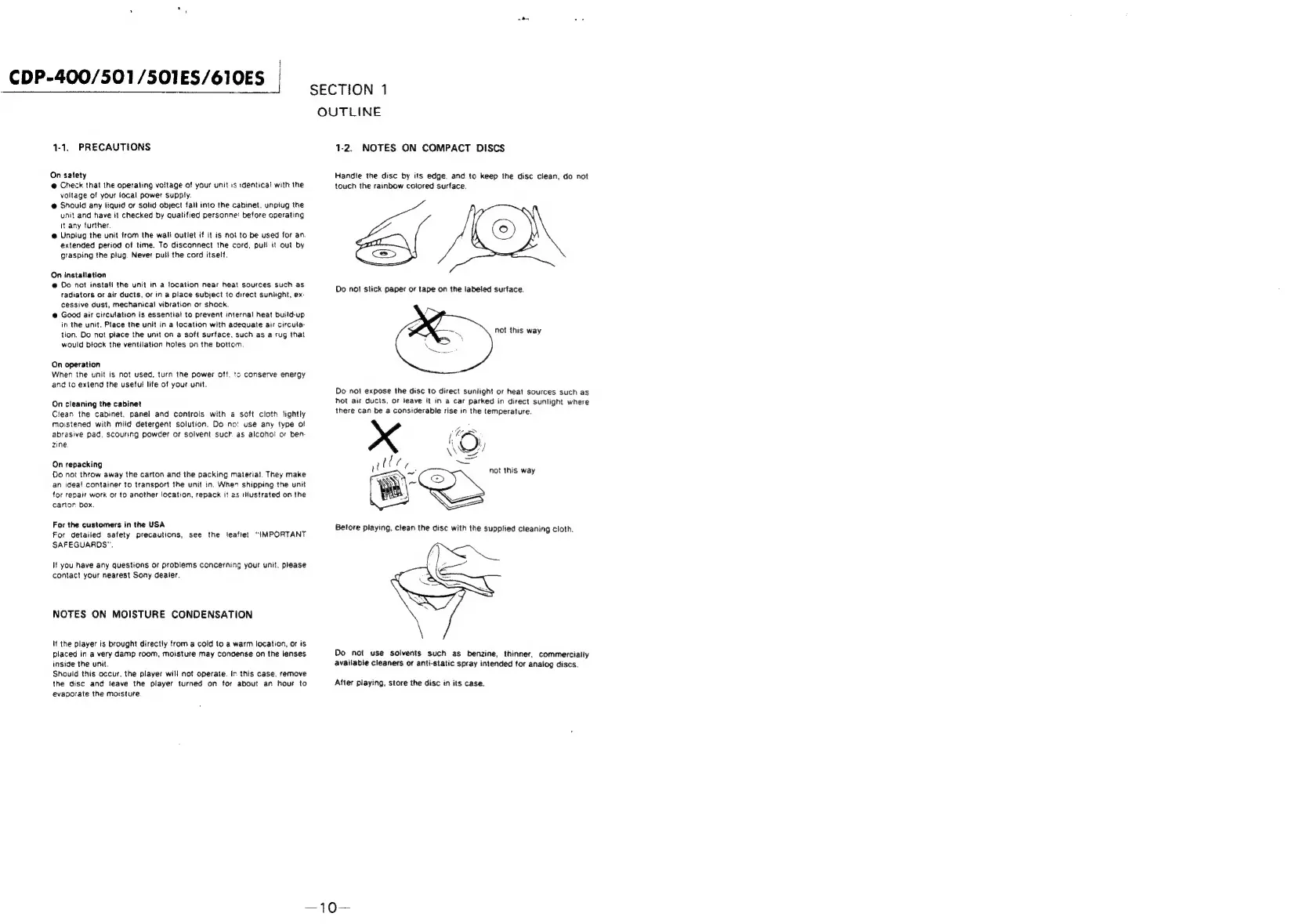 Sony CDP-400 - Notes on Compact Discs; Notes on Moisture Condensation