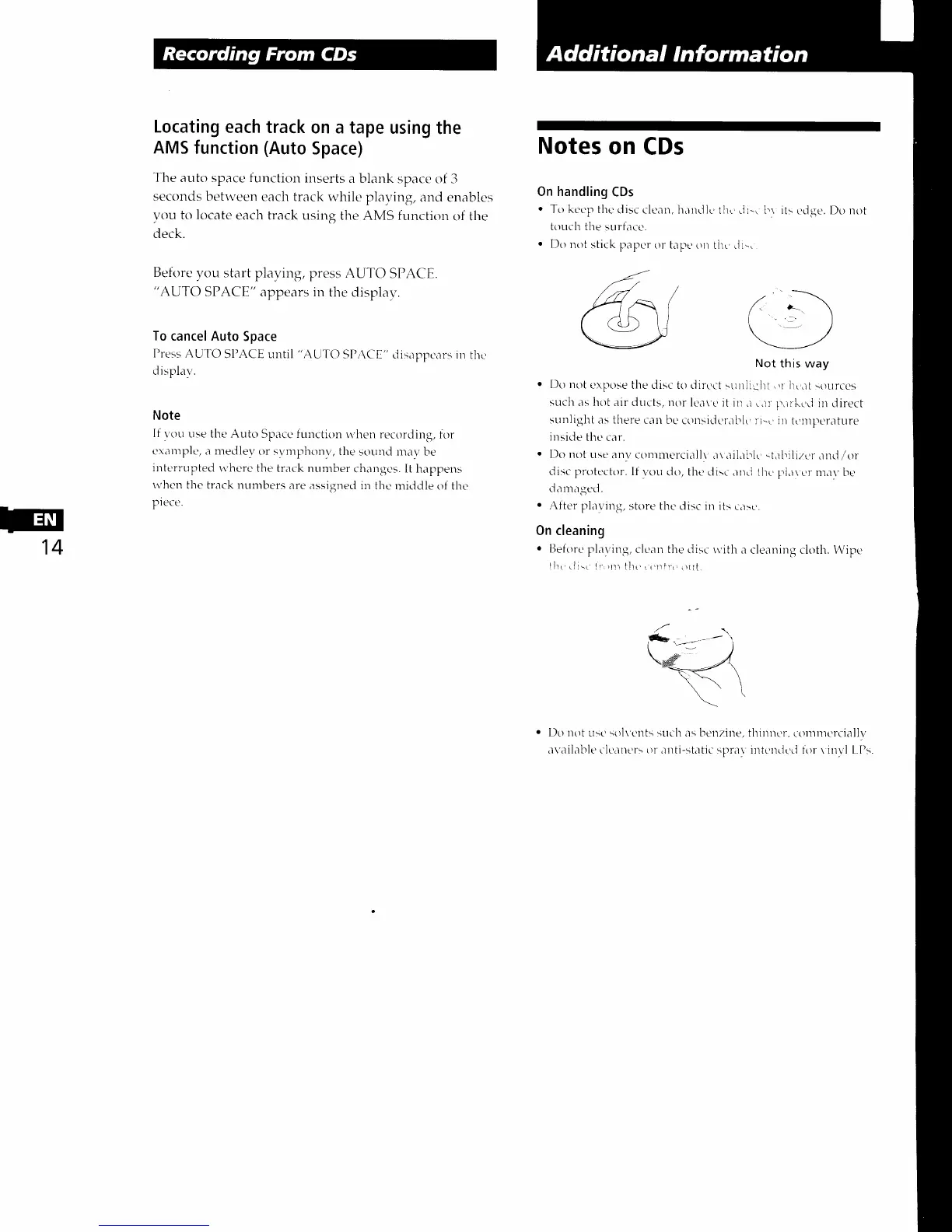 Sony CDP-461 - Recording CDs: Auto Space and CD Handling; AMS Function (Auto Space); Notes on CD Handling