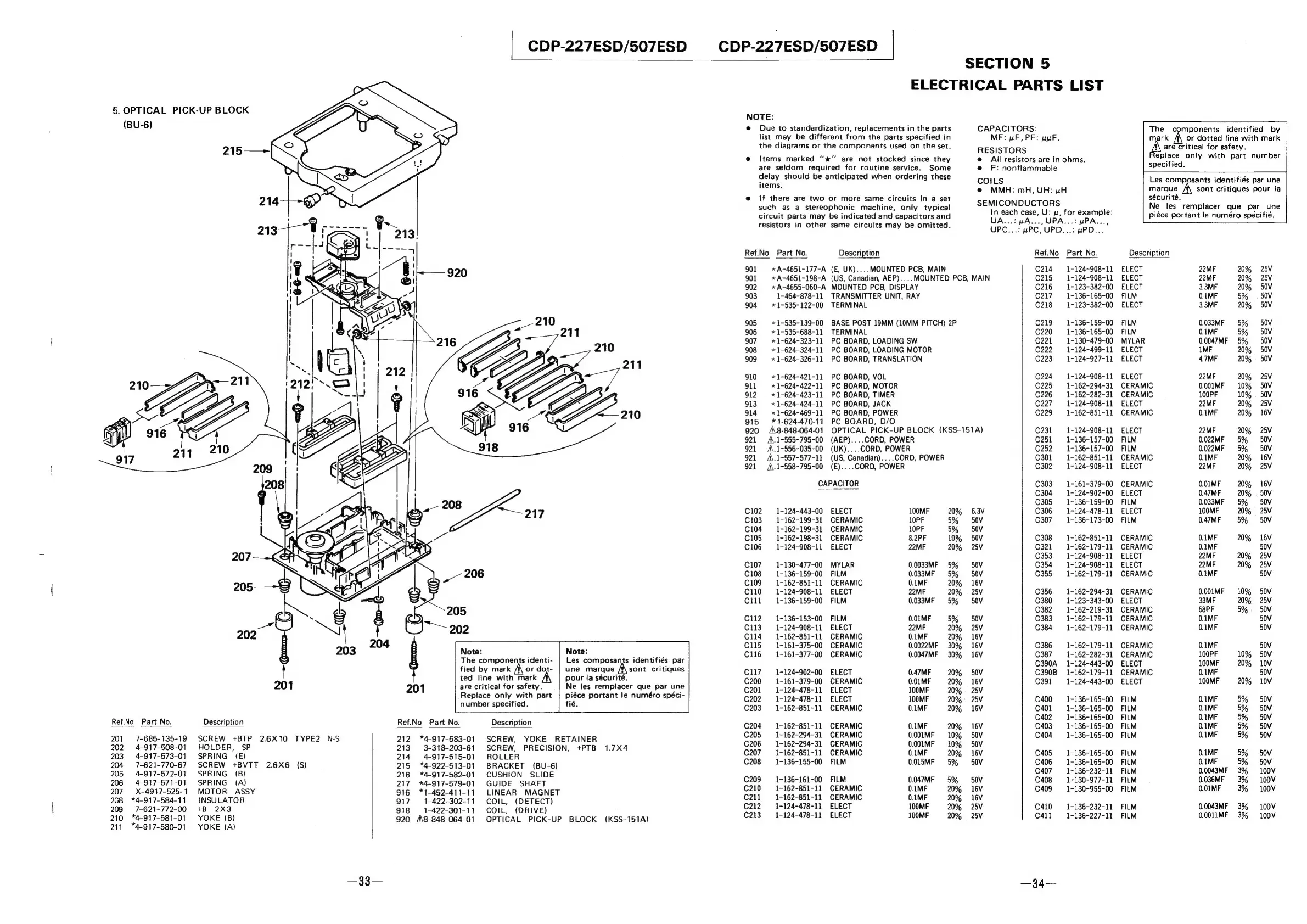 Sony CDP-507ESD - SECTION 5 ELECTRICAL PARTS LIST; Optical Pick-up Block Components
