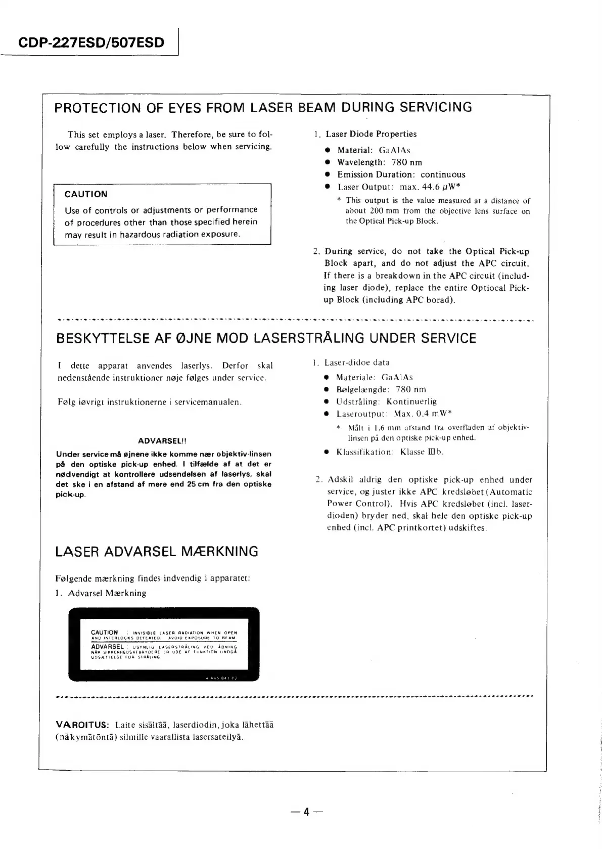 Sony CDP-507ESD - Protection of Eyes from Laser Beam; Laser Diode Properties and Safety