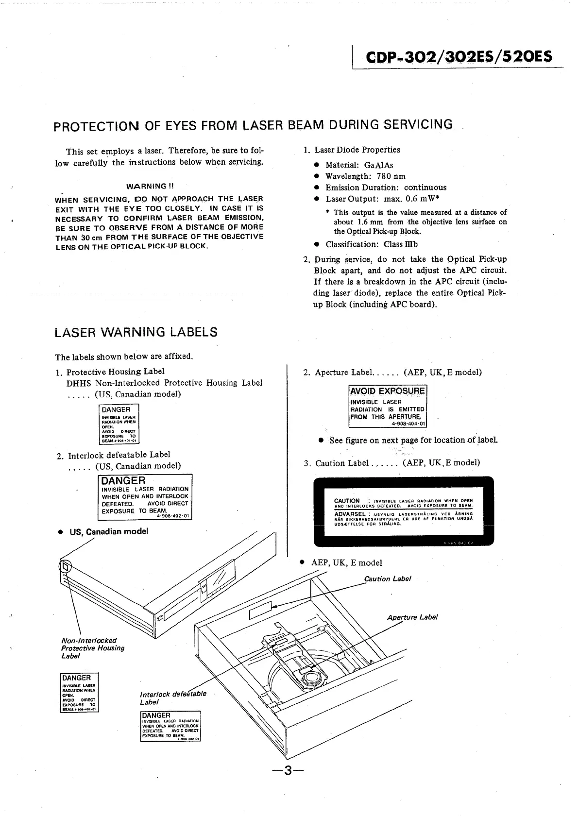 Sony CDP-520ES - Protection of Eyes from Laser Beam During Servicing; Laser Warning Labels