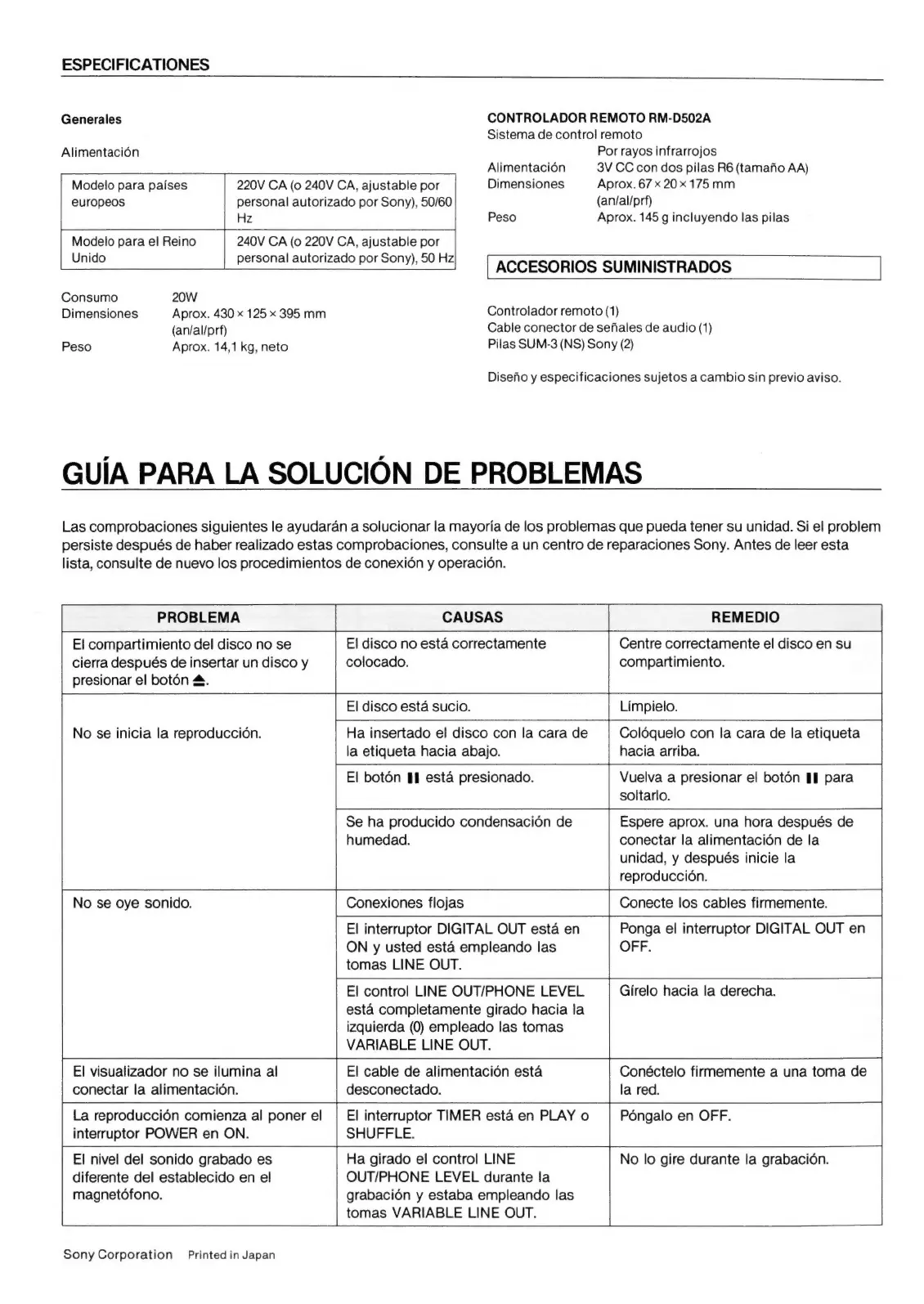 Sony CDP-555ESD - Especificationes; Accesorios Suministrados; Guía para la Solución de Problemas