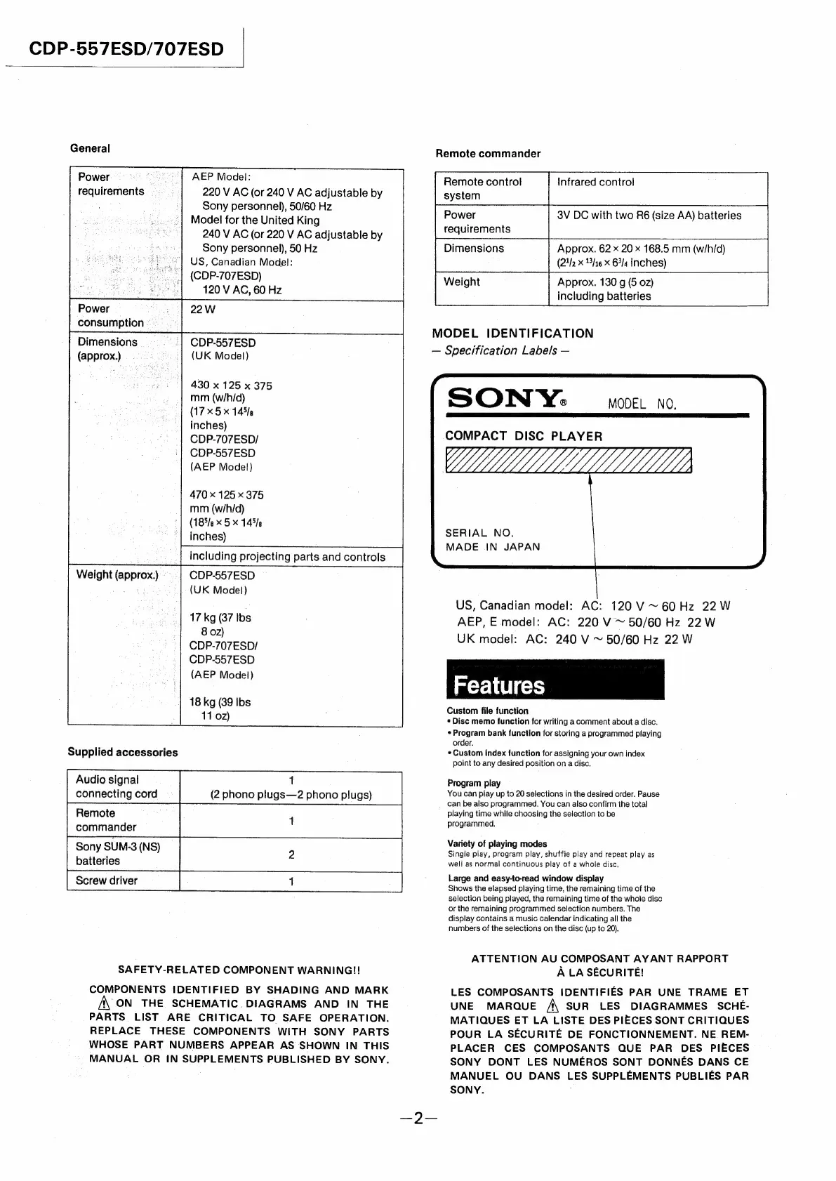 Sony CDP-557ESD - General Information; Unit Specifications; Features; Player Functionality