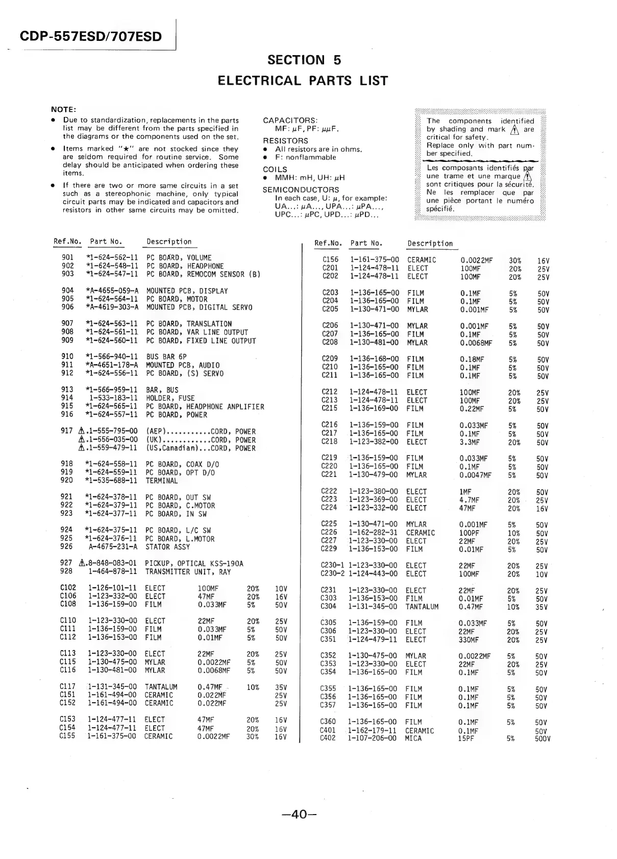 Sony CDP-557ESD - Section 5: Electrical Parts List; Capacitors and Semiconductors