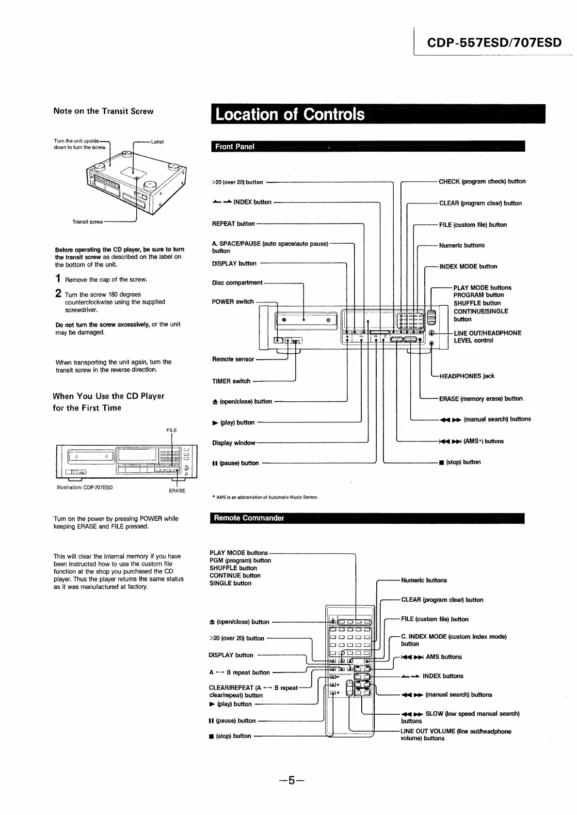 Sony CDP-557ESD - Location of Controls; Front Panel Controls; Remote Commander Layout
