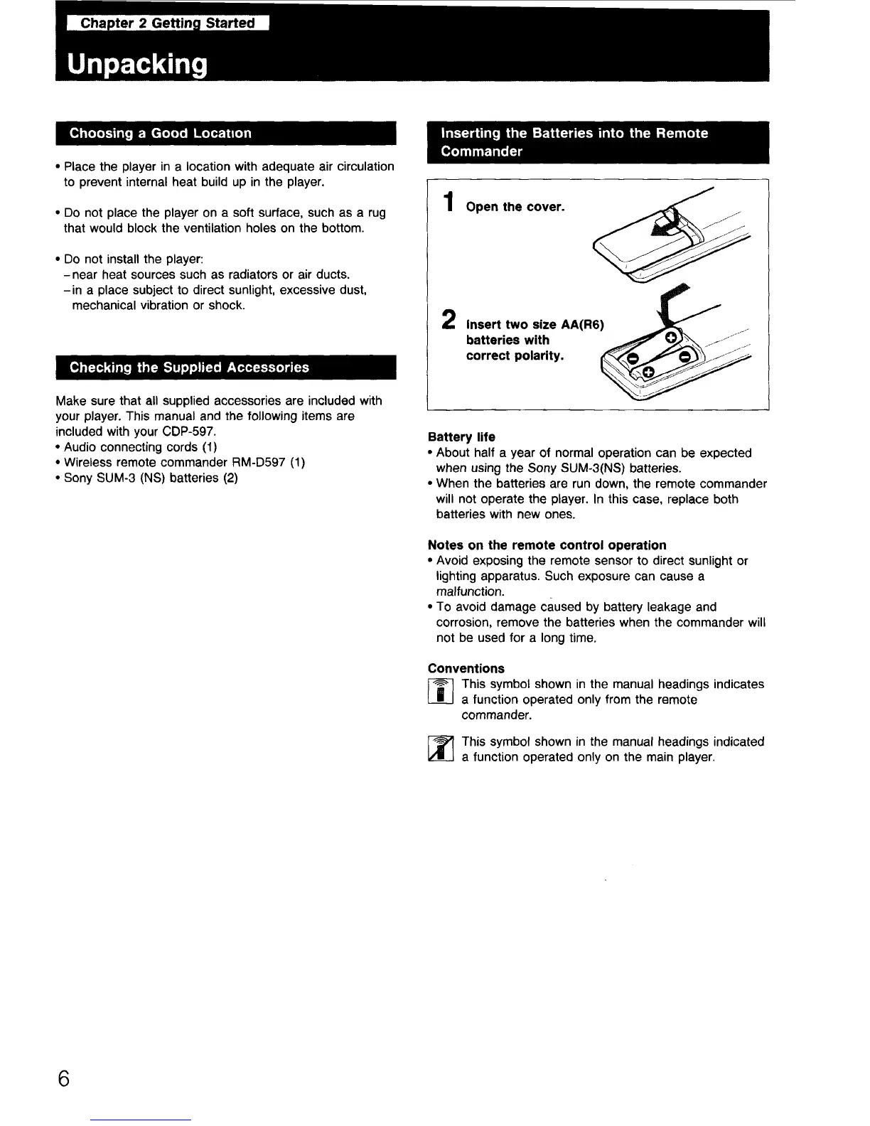 Sony CDP-597 - Unpacking; Choosing a Good Location; Checking the Supplied Accessories; Inserting the Batteries into the Remote Commander