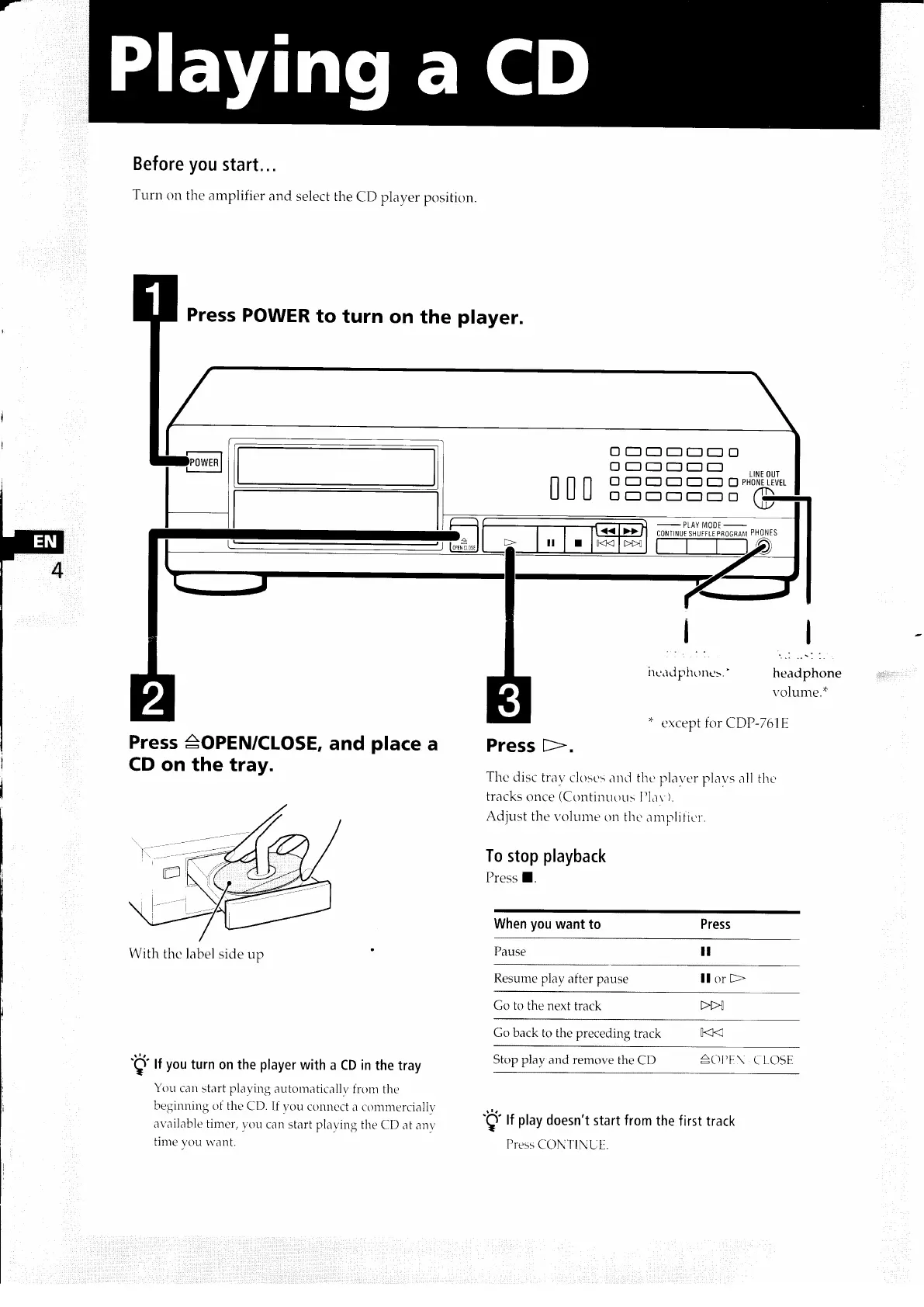 Sony CDP-761 - Playing a CD; Powering On and Loading Disc; Controlling Playback