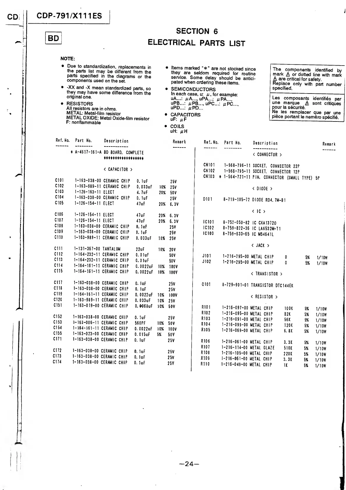 Sony CDP-791 - SECTION 6 ELECTRICAL PARTS LIST; BD Board Component Listings