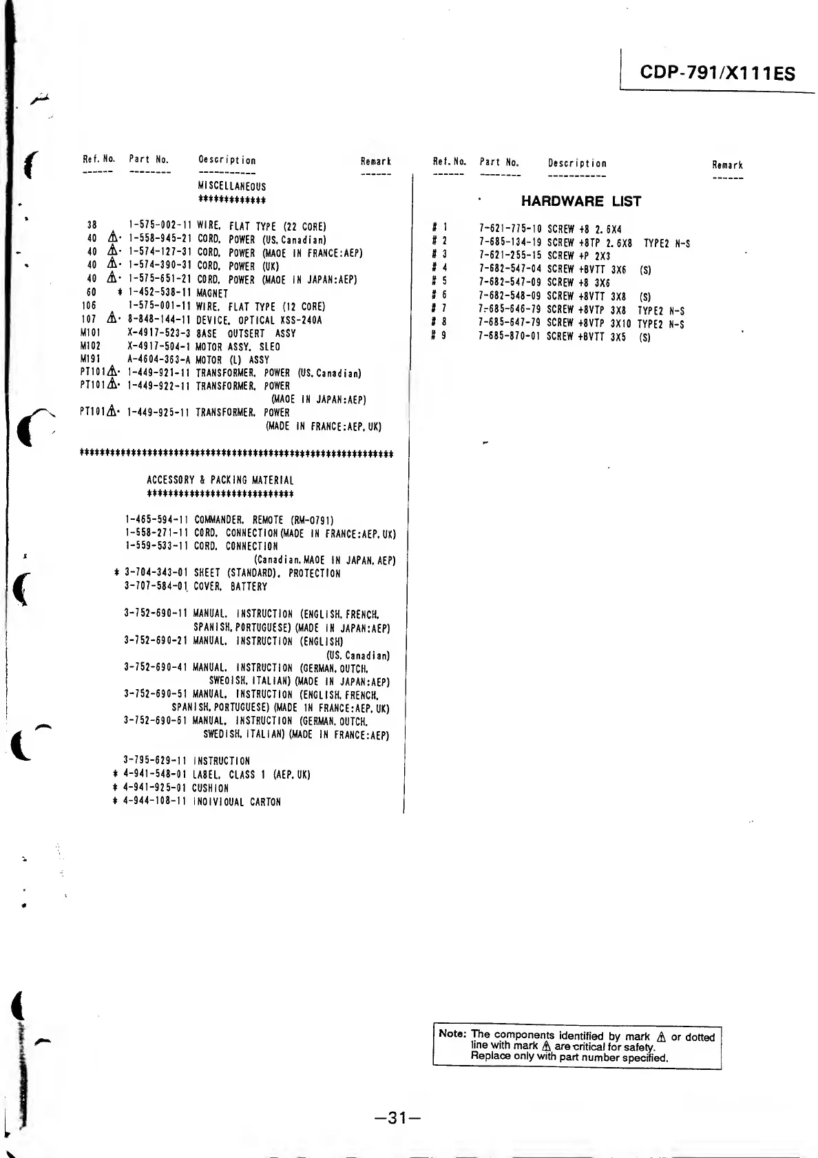 Sony CDP-791 - HARDWARE LIST; Hardware Components List; ACCESSORY & PACKING MATERIAL; Included Accessories and Manuals List