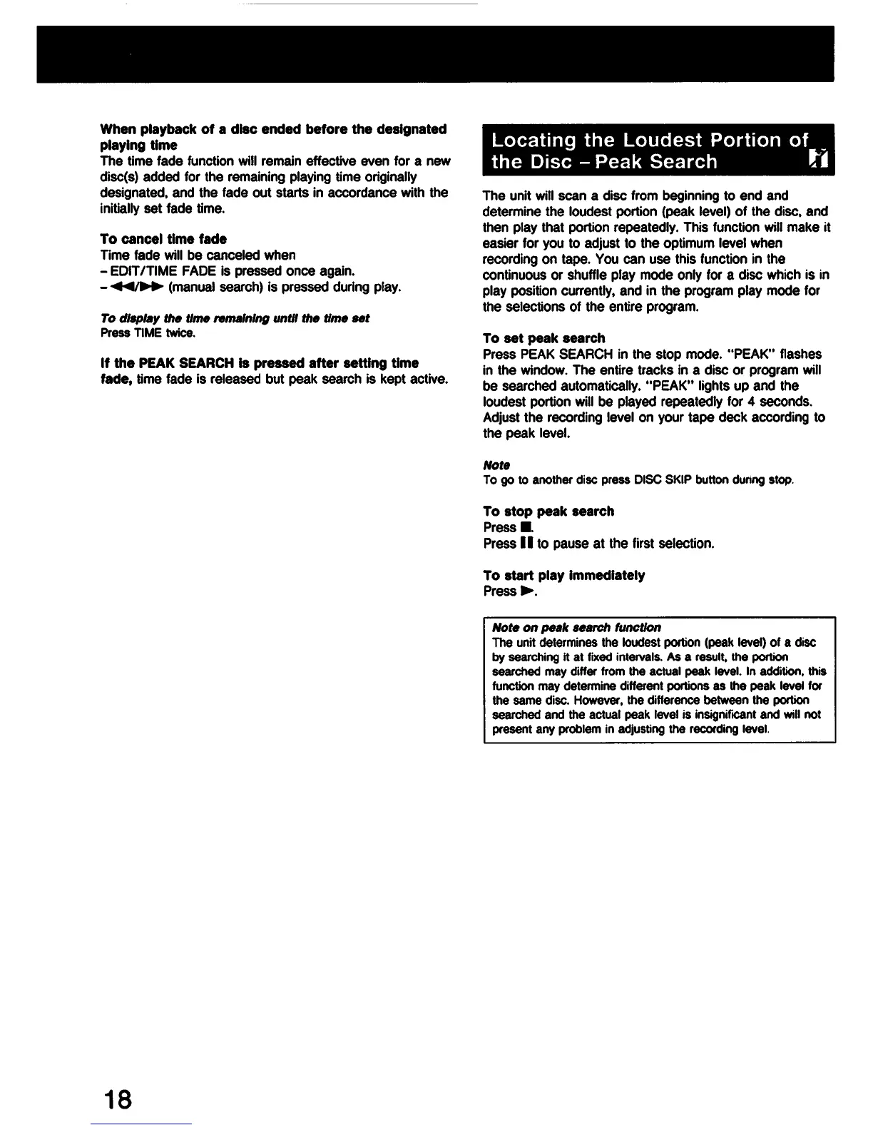Sony CDP-C225 - Peak Search Function; Peak Search Operation; Peak Search Controls; Peak Search Notes
