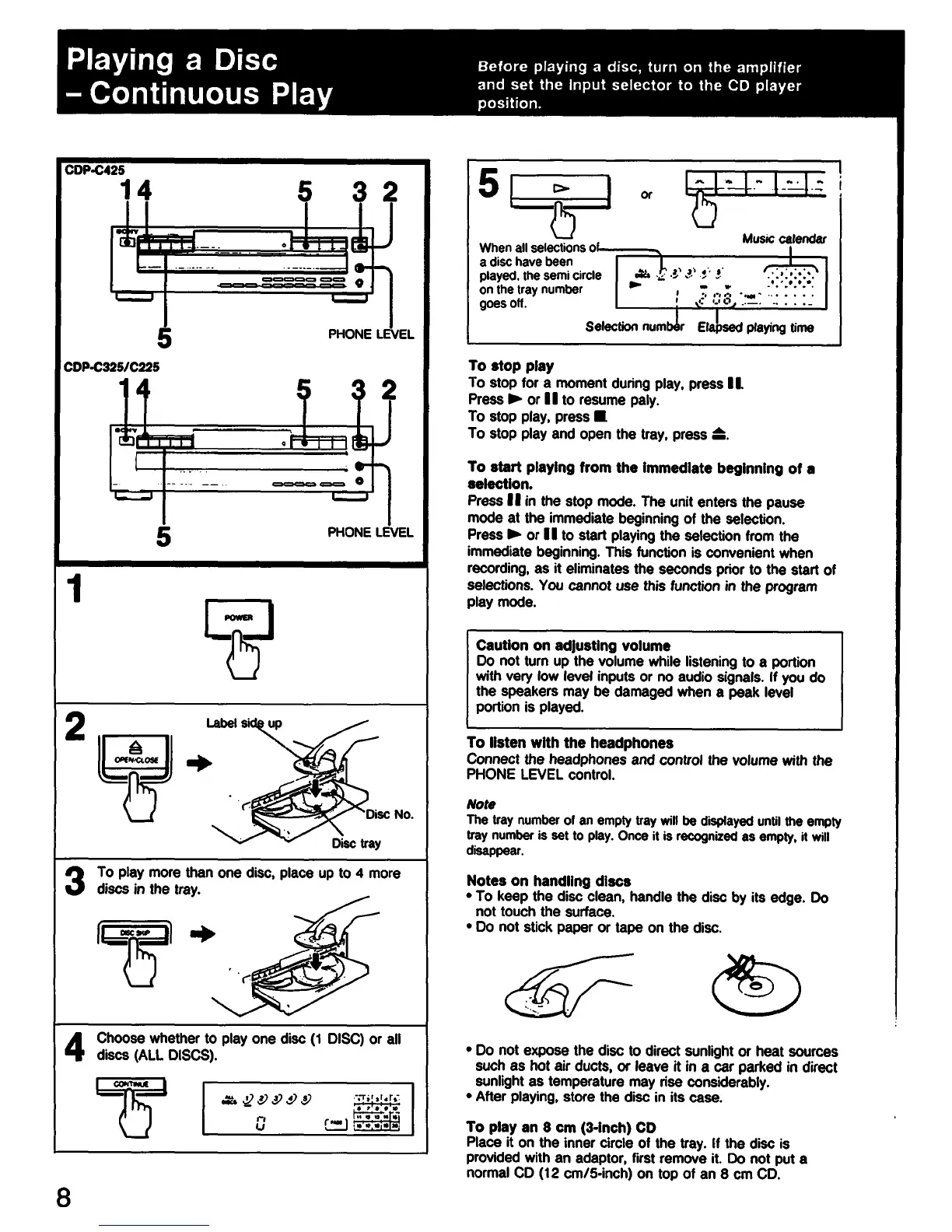 Sony CDP-C225 - Continuous Playback; Basic Playback Controls; Special Playback Features; Disc Handling Notes