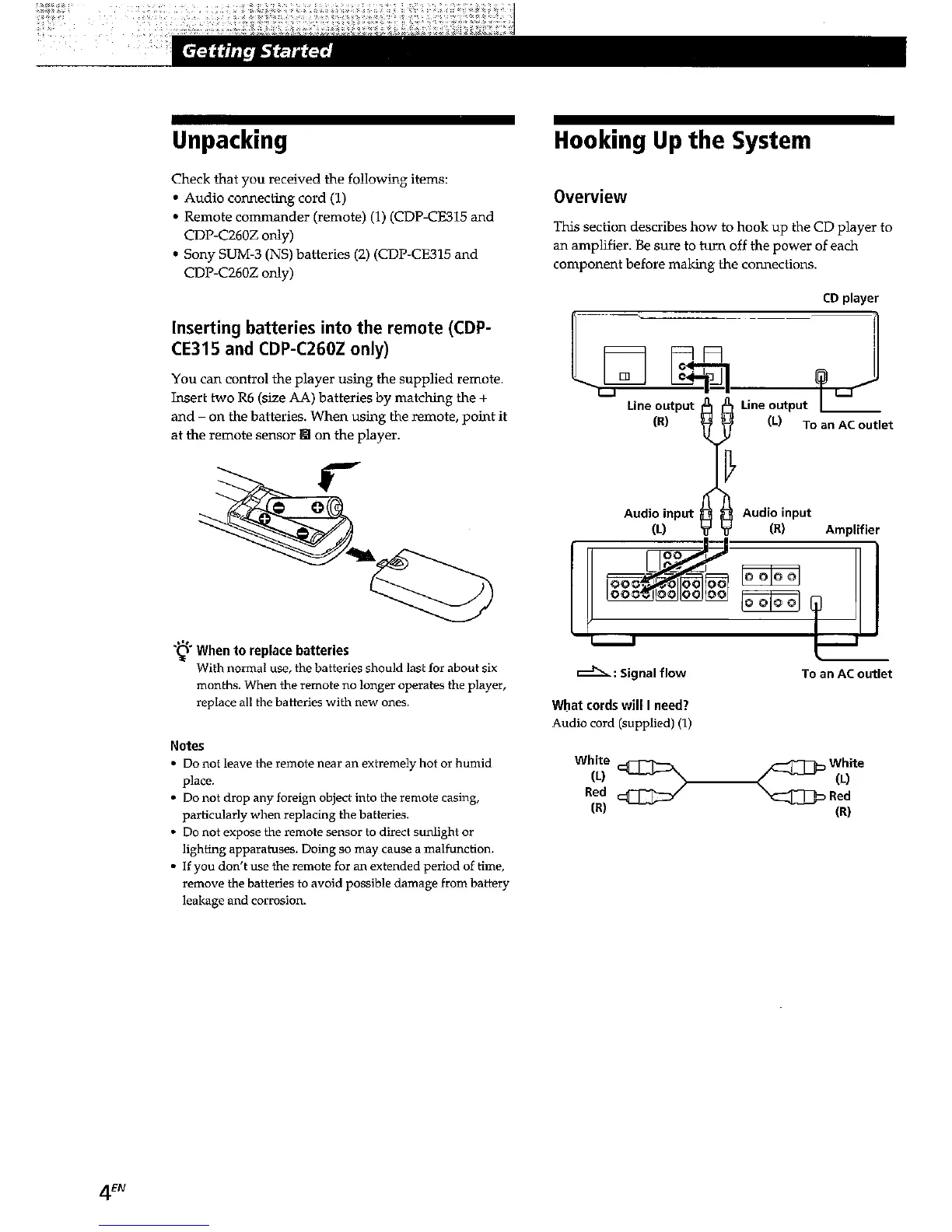 Sony CDP-C260Z - Getting Started; Unpacking and System Setup; Remote Control and Battery Information