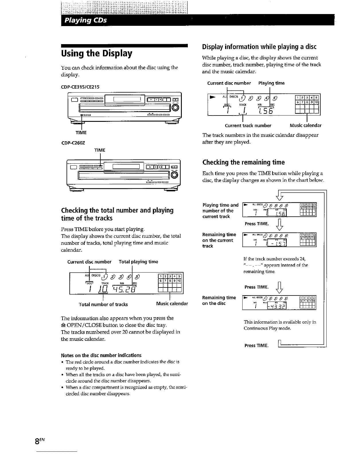 Sony CDP-C260Z - Playing CDs; Using the Player Display; Checking Remaining Time on CDs