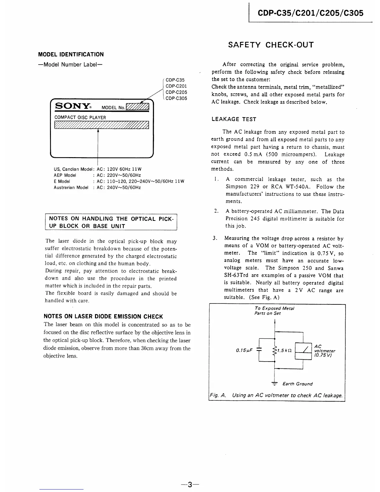 Sony CDP-C305 - Optical Pick-up Block Handling Precautions; Laser Diode Emission Check Safety; Safety Check-Out Procedures; AC Leakage Test Procedure