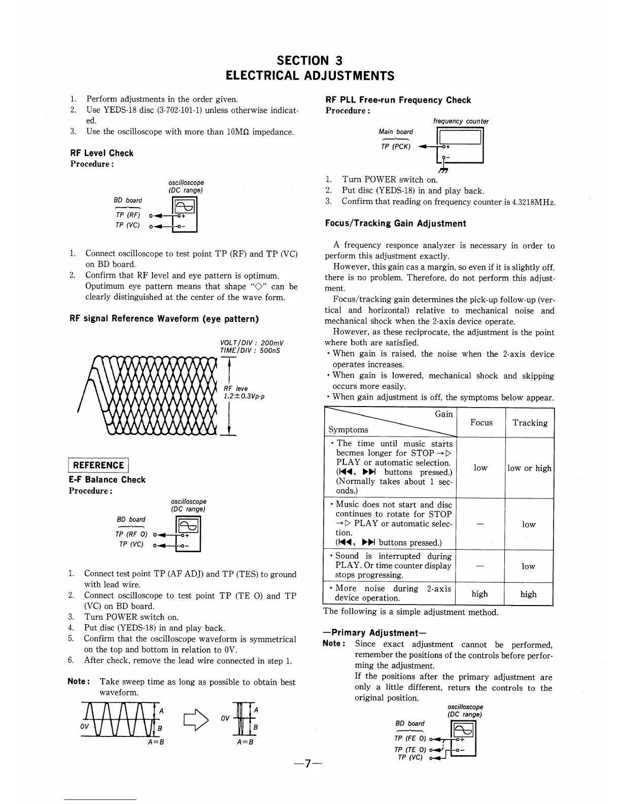 Sony CDP-C305 - Electrical Adjustments; RF Level Check Procedure; RF PLL Free-run Frequency Check; Focus and Tracking Gain Adjustment