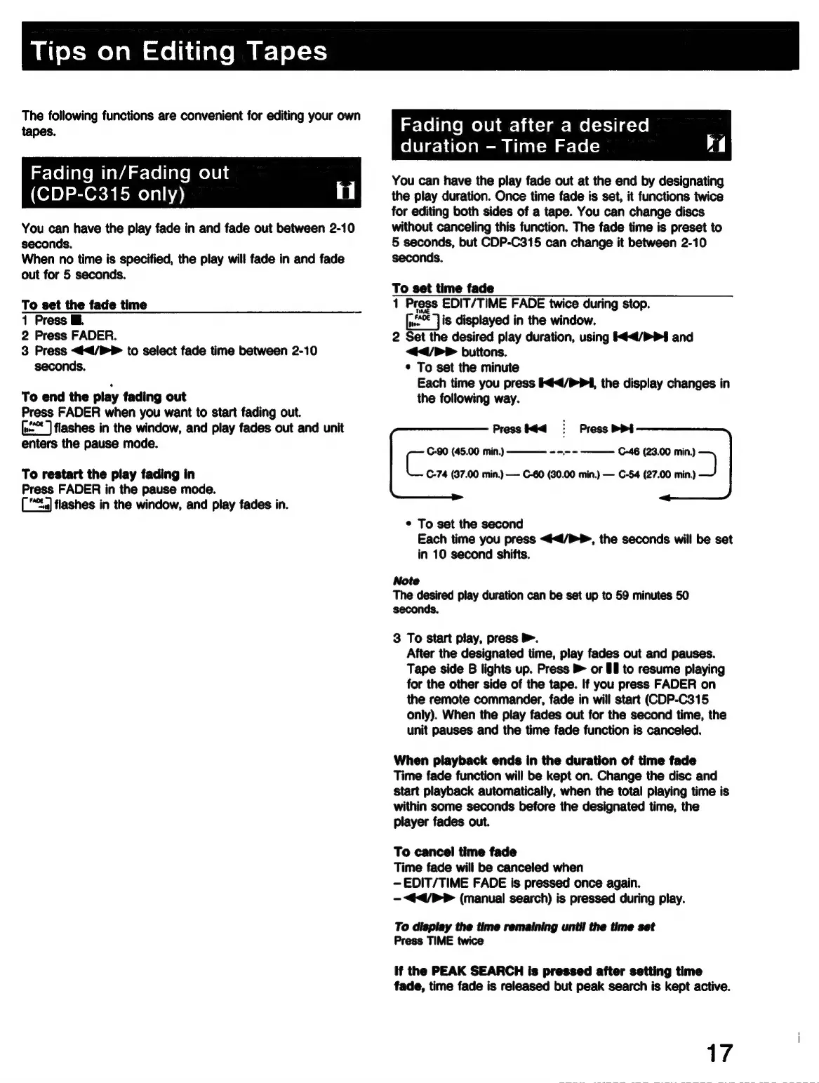 Sony CDP-C315 - Tape Editing Tips; Fading In and Out; Time Fade Function; Cancelling and Checking Time Fade