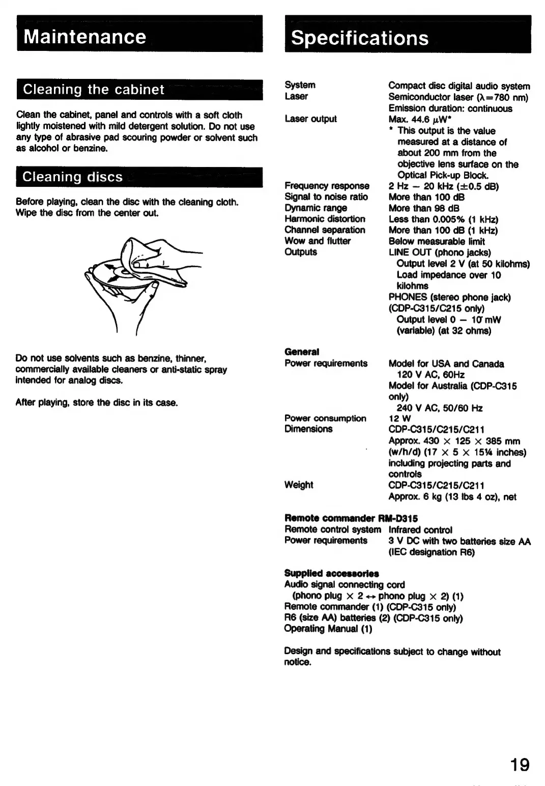 Sony CDP-C315 - Maintenance and Specifications; Cleaning Procedures; Technical Specifications