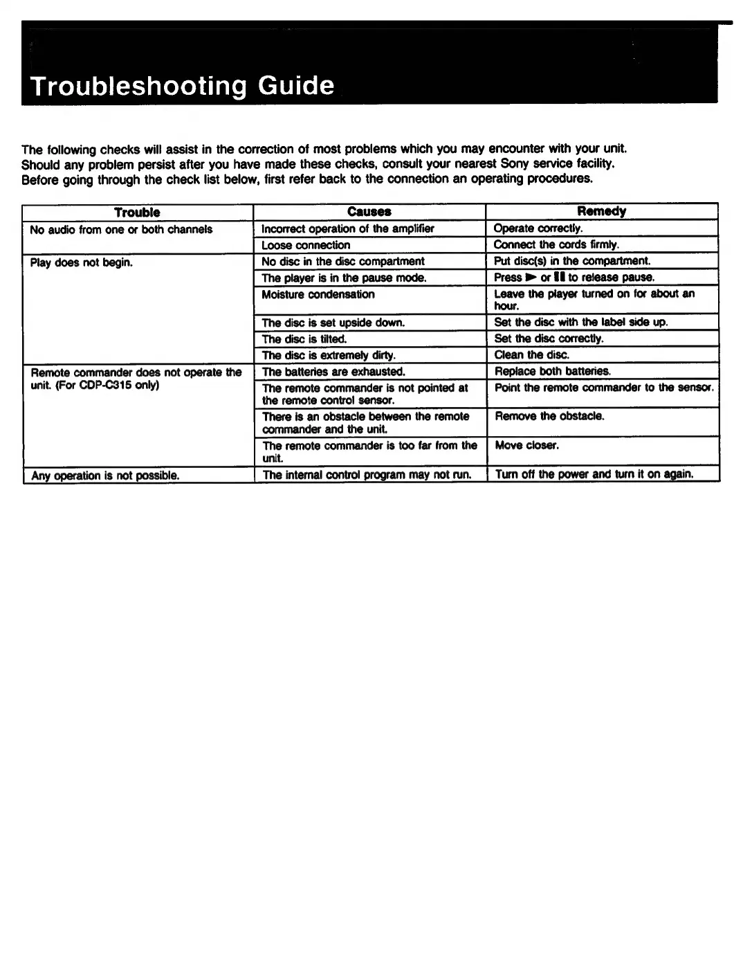 Sony CDP-C315 - Troubleshooting Guide; Audio Output Issues; Playback Start Problems; Remote Control Issues